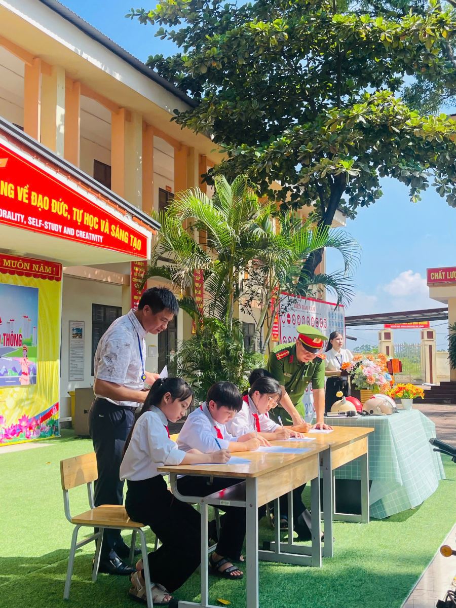 Bên cạnh nội dung tuyên truyền, Công an xã Vĩnh An phối hợp với Ban Giám hiệu nhà trường tổ chức cho giáo viên, phụ huynh và học sinh ký cam kết chấp hành nghiêm chỉnh Luật Giao thông đường bộ. Việc ký cam kết góp phần củng cố nhận thức, tạo sự đồng thuận và phối hợp chặt chẽ giữa gia đình, nhà trường và lực lượng Công an trong việc giáo dục học sinh.