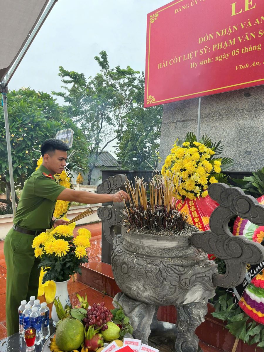 Cán bộ Công an xã Vĩnh An thắp hương trong buổi lễ Hoạt động này thể hiện tình cảm, trách nhiệm và lòng biết ơn sâu sắc của lực lượng Công an nhân dân đối với các anh hùng liệt sĩ - những người đã hy sinh vì độc lập, tự do của Tổ quốc.