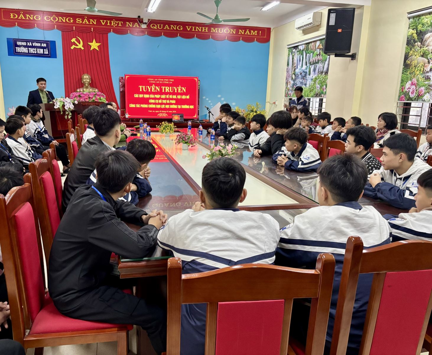 Nhằm nâng cao nhận thức và ý thức chấp hành pháp luật cho lứa tuổi học sinh, ngày 09/02/2026, Công an xã Vĩnh An đã phối hợp với Trường THCS Kim Xá tổ chức buổi tuyên truyền, phổ biến các quy định về quản lý vũ khí, vật liệu nổ, công cụ hỗ trợ, pháo và công tác phòng chống bạo lực học đường cho toàn thể cán bộ, giáo viên, phụ huynh và học sinh nhà trường.