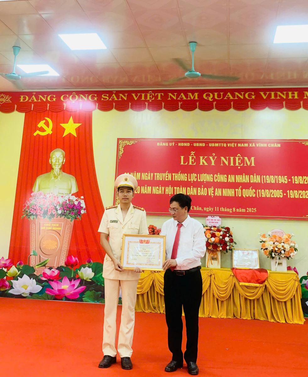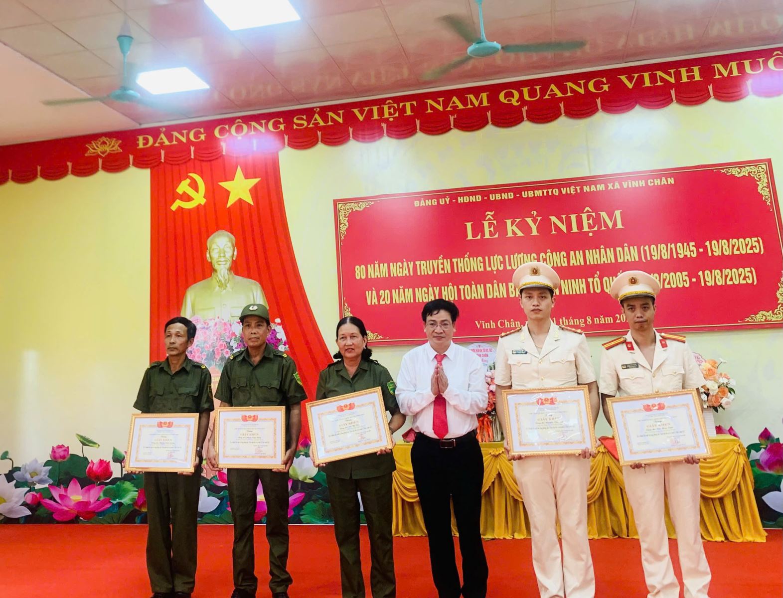 Ghi nhận kết quả đạt được, ngày 11/8/2025, Chủ tịch Ủy ban nhân dân xã đã tặng Giấy khen cho tập thể Công an xã Vĩnh Chân, hai cán bộ Công an xã và ba thành viên Tổ bảo vệ an ninh trật tự vì có thành tích xuất sắc trong phong trào Toàn dân bảo vệ an ninh Tổ quốc năm 2025.
