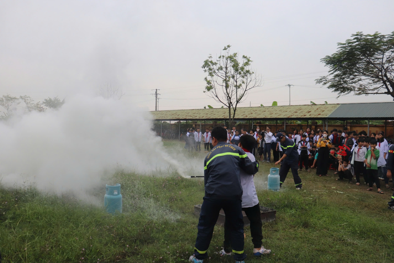 Phần thực hành được tổ chức ngay tại sân trường với mô hình tình huống giả lập. Dưới sự hướng dẫn của cán bộ chuyên môn, học sinh trực tiếp sử dụng bình chữa cháy xách tay để xử lý điểm cháy mô phỏng. Việc thao tác từng bước giúp các em hiểu rõ cấu tạo bình chữa cháy, quy trình sử dụng và cách bảo đảm an toàn cho bản thân khi tiếp cận đám cháy. Trong suốt quá trình thực hành, lực lượng Công an thường xuyên theo sát, hướng dẫn và chỉnh sửa thao tác cho từng học sinh.