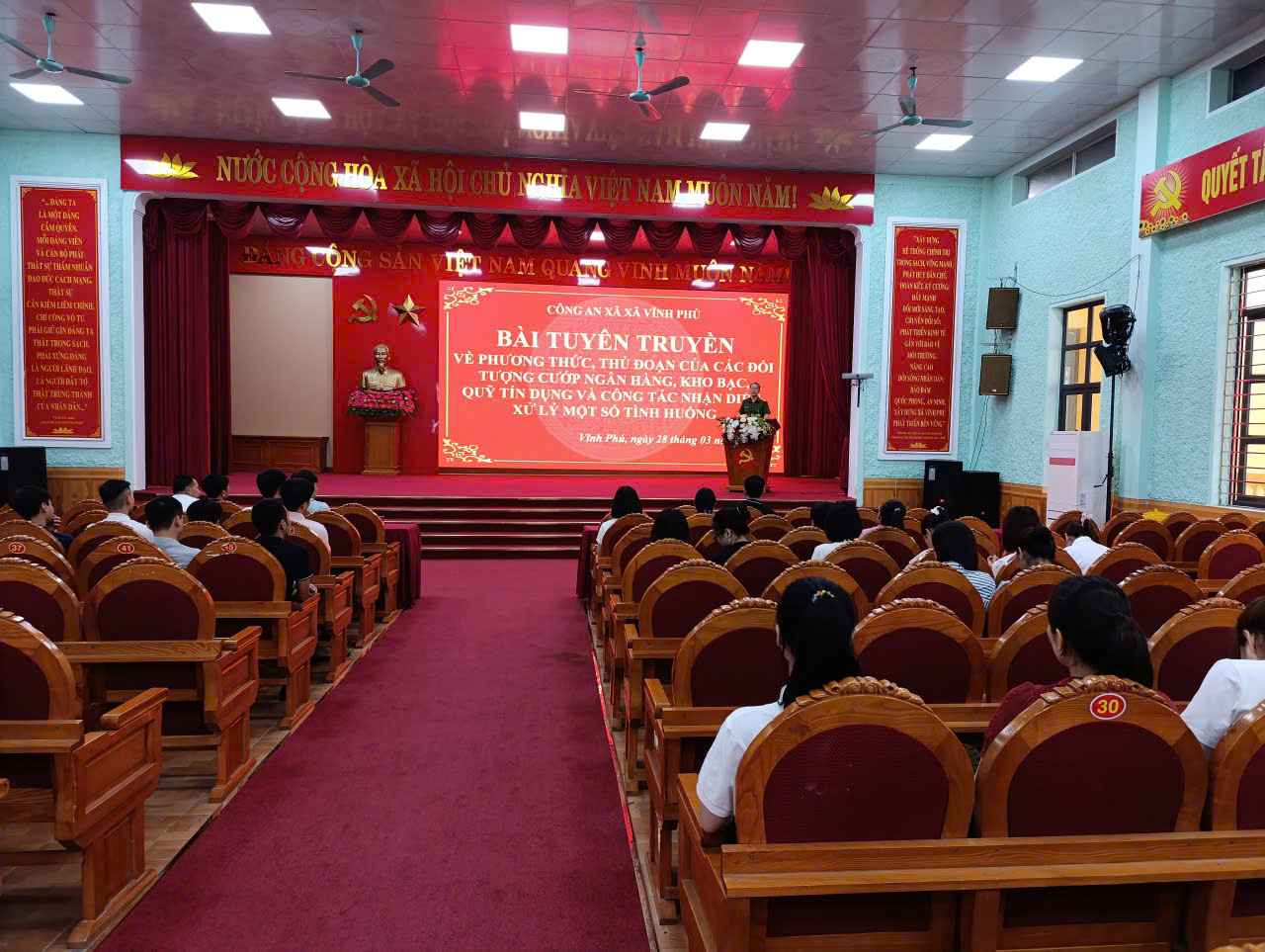 Sáng ngày 28/3/2026, Công an xã Vĩnh Phú tổ chức hội nghị tuyên truyền về phương thức, thủ đoạn của tội phạm cướp ngân hàng, kho bạc, quỹ tín dụng và hướng dẫn kỹ năng nhận diện, xử lý tình huống cho cán bộ, nhân viên các cơ sở giao dịch tiền tệ trên địa bàn.