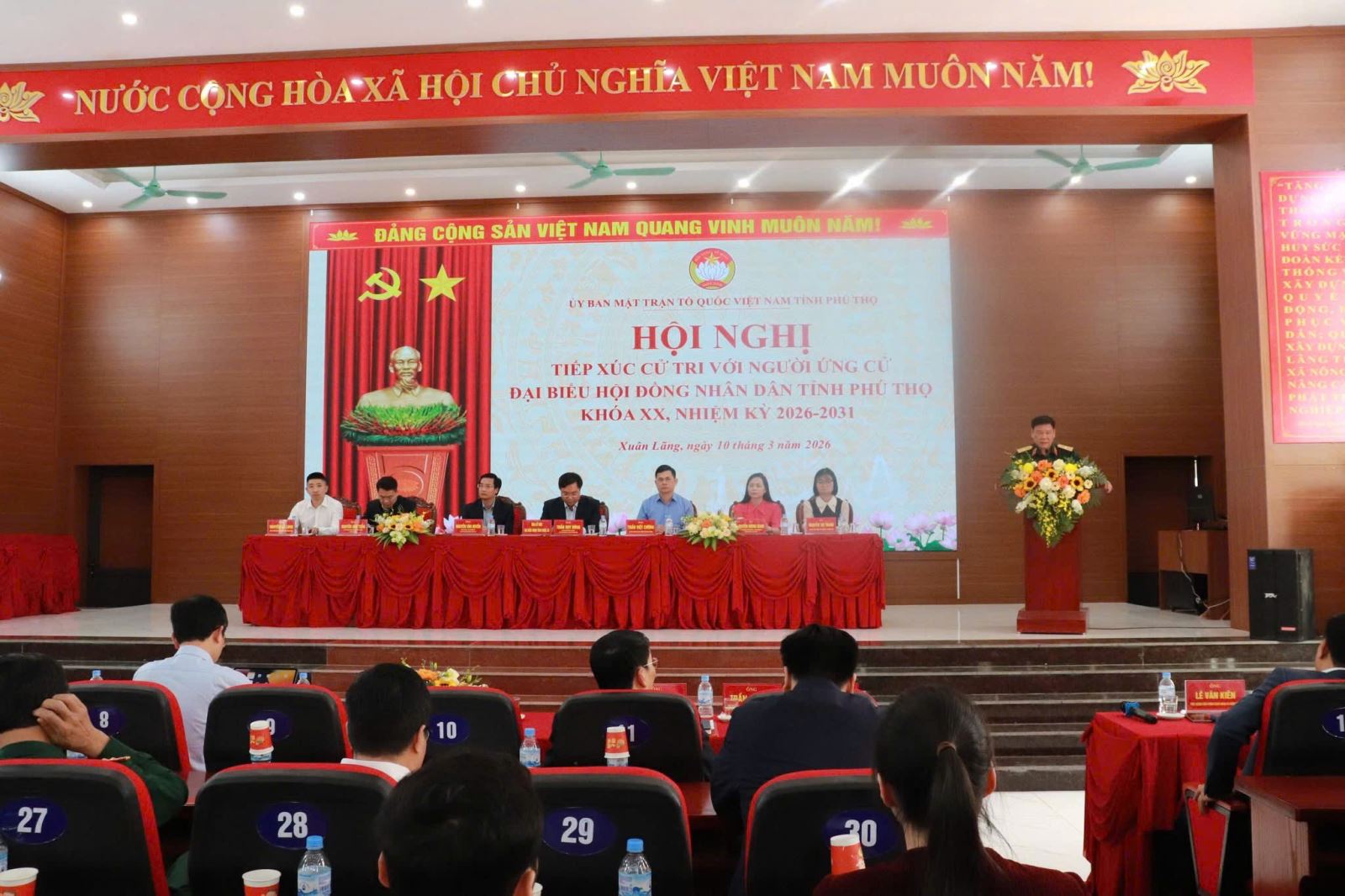 Tham dự hội nghị có các đại biểu, cử tri trên địa bàn xã cùng những người ứng cử đại biểu Hội đồng nhân dân tỉnh Phú Thọ nhiệm kỳ 2026 – 2031, trong đó có đồng chí Trần Duy Đông, Chủ tịch Ủy ban nhân dân tỉnh Phú Thọ được giới thiệu ứng cử.