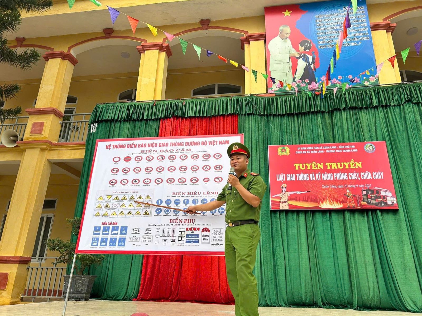 Công an xã Xuân Lãng tuyên truyền Luật Giao thông đường bộ và kỹ năng PCCC cho cán bộ, giáo viên và học sinh trên địa bàn (02/10/2025)