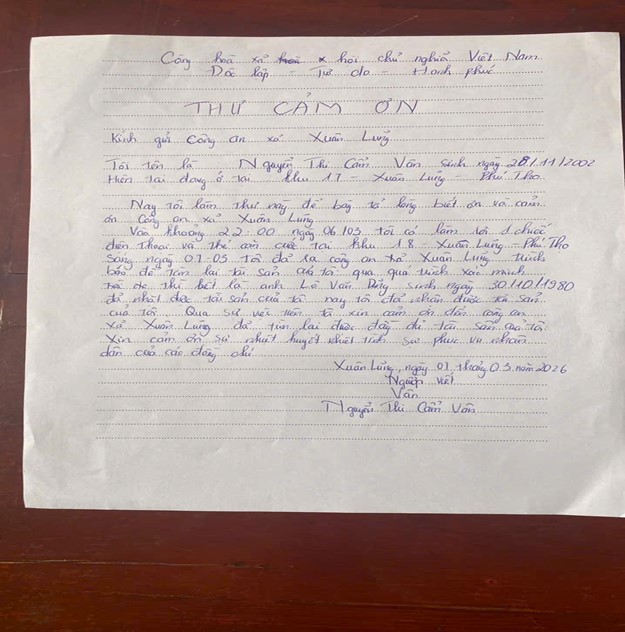 Công an xã Xuân Lũng nhanh chóng xác minh, hỗ trợ công dân nhận lại tài sản bị mất (10/03/2026)