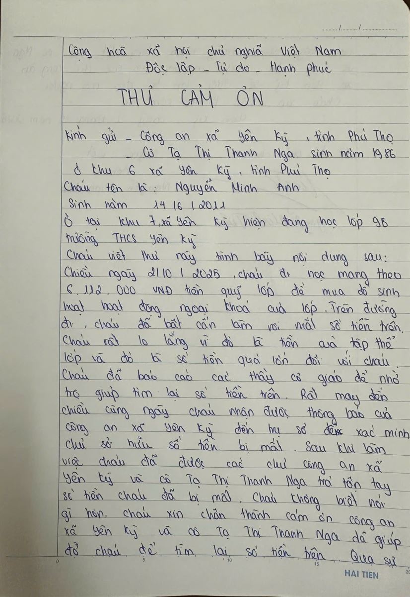 Chiều ngày 02/10/2025, Công an xã Yên Kỳ tiếp nhận thông tin của chị Tạ Thị Thanh Nga sinh năm 1986, trú tại khu 6, xã Yên Kỳ, tỉnh Phú Thọ về việc chị nhặt được một phong bì bên trong có 6.112.000 đồng tiền mặt trên đường. Với tinh thần trung thực, trách nhiệm, ngay sau khi nhặt được, chị Nga đã trực tiếp mang phong bì trên đến trụ sở Công an xã để trình báo, mong muốn tìm và trả lại cho người bị đánh rơi.
