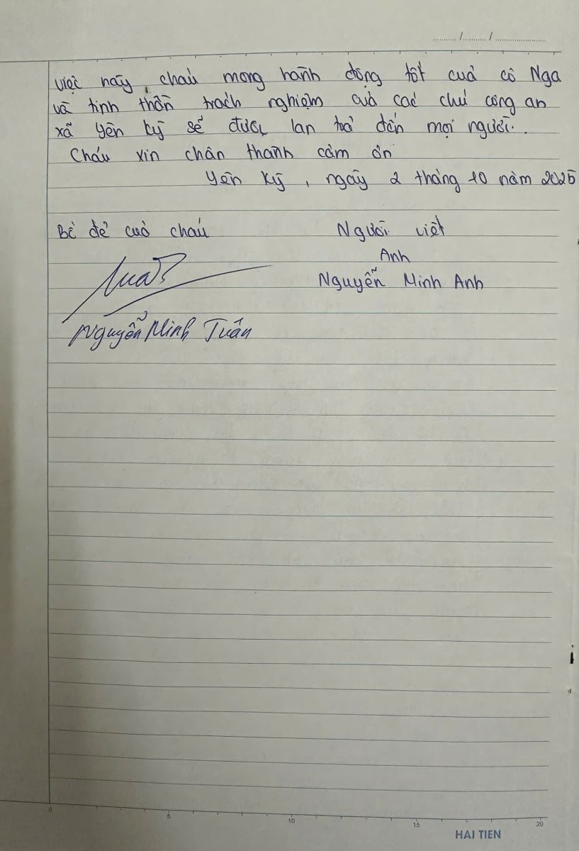 Học sinh viết thư Công an xã Yên Kỳ và chị Thanh Nga
