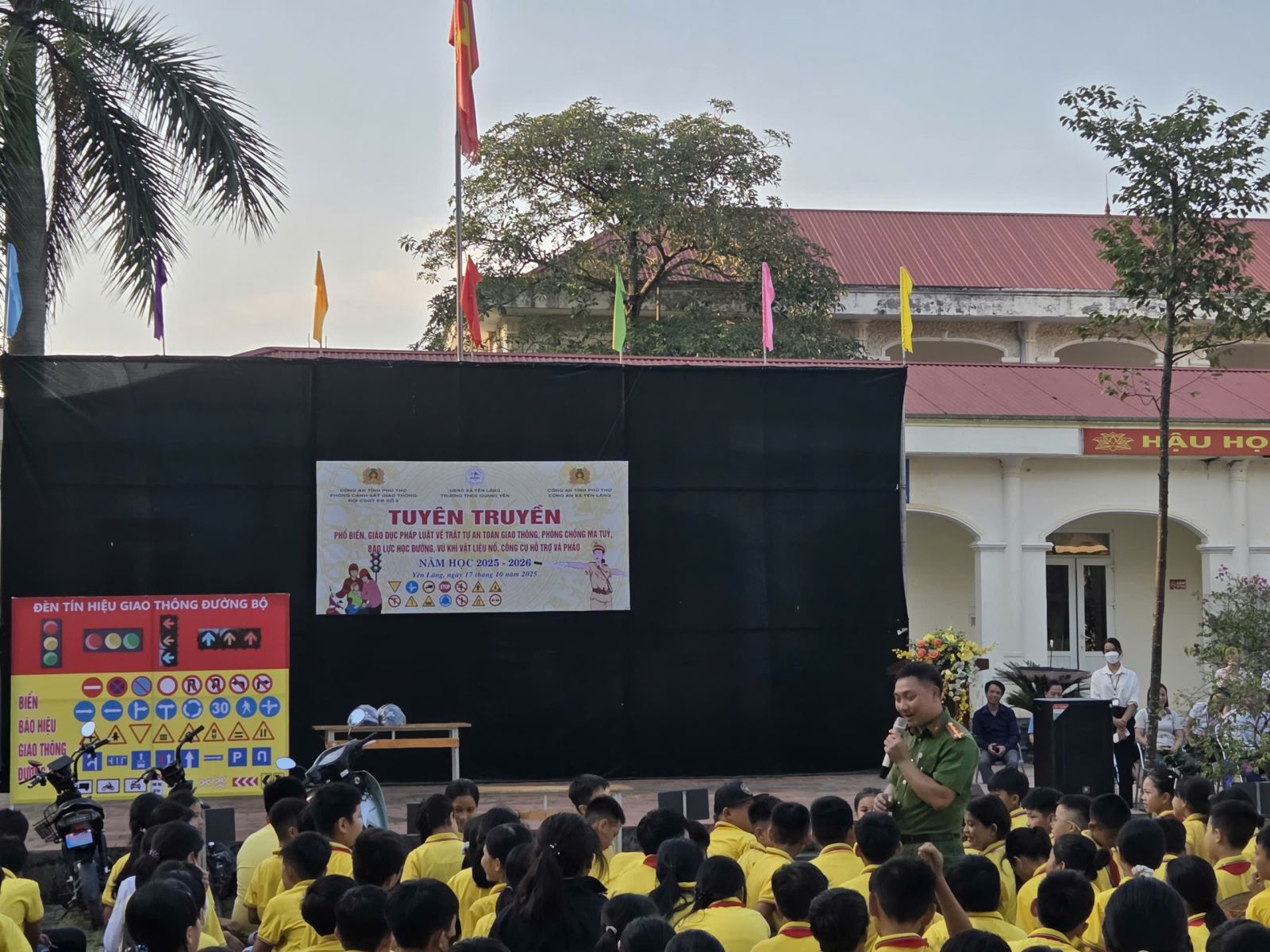 Nhằm góp phần xây dựng môi trường học đường an toàn, lành mạnh, ngày 18/10/2025, Công an xã Yên Lãng phối hợp Phòng Cảnh sát giao thông - Công an tỉnh Phú Thọ tổ chức buổi tuyên truyền, phổ biến pháp luật về an toàn giao thông đường bộ; phòng, chống bạo lực học đường và tệ nạn xã hội cho hơn 300 cán bộ, giáo viên và học sinh Trường THCS Quang Yên và Trường THCS Lãng Công.