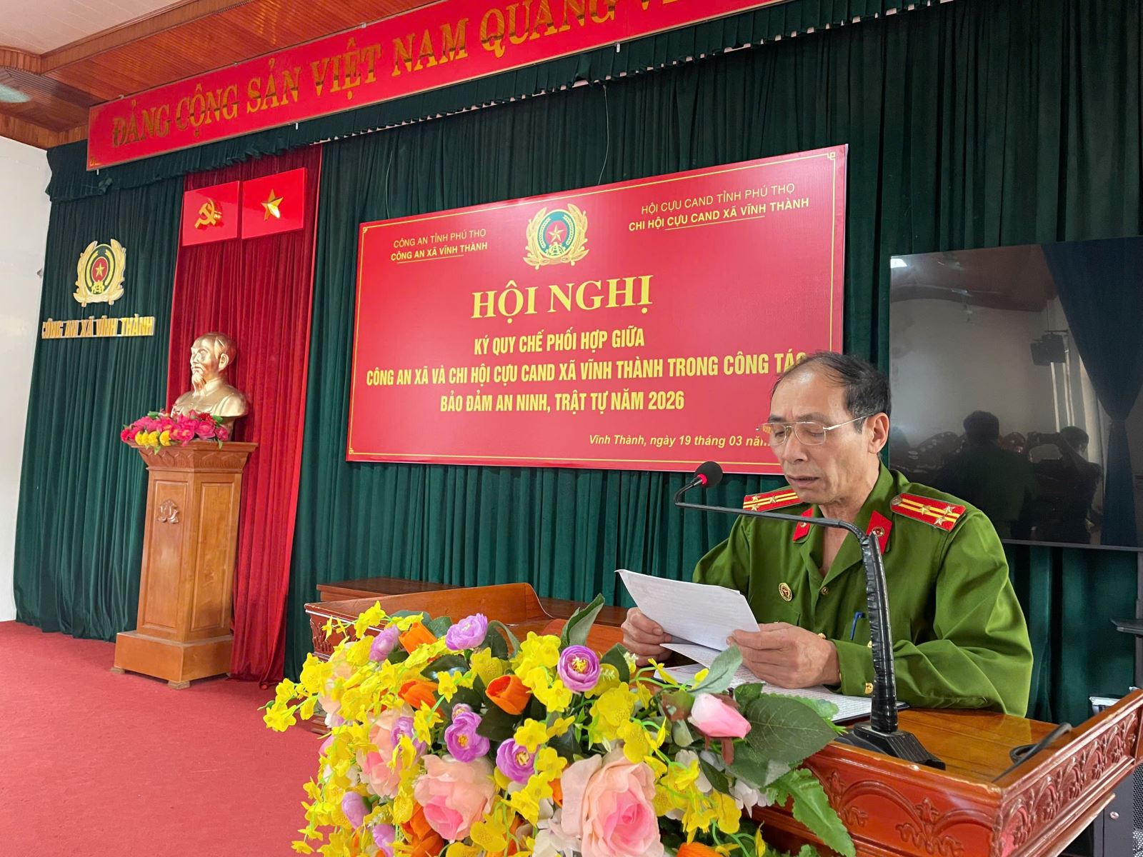 Dự và chỉ đạo Hội nghị có đồng chí Ngô Hữu Mai - Bí thư Đảng ủy, Chủ tịch HĐND xã Vĩnh Thành; đồng chí Phùng Đắc Chiến - Phó Bí thư Đảng ủy, Chủ tịch UBND xã Vĩnh Thành; cùng đại diện lãnh đạo UBND, Ủy ban MTTQ và các tổ chức chính trị - xã hội trên địa bàn. Về phía Công an xã, Chi hội Cựu CAND xã có các đồng chí chỉ huy, CBCS Công an xã, đồng chí trong Ban Thường trực và đông đảo hội viên Chi hội Cựu CAND xã. Đ/c Thượng tá Hoàng Minh Khanh - Ủy viên Ban Thường vụ Đảng ủy, Bí thư Chi bộ, Trưởng Công an xã và Đ/c Thượng tá Nguyễn Văn Tuân - Chi hội trưởng Chi hội Cựu CAND xã Vĩnh Thành đồng chủ trì hội nghị.