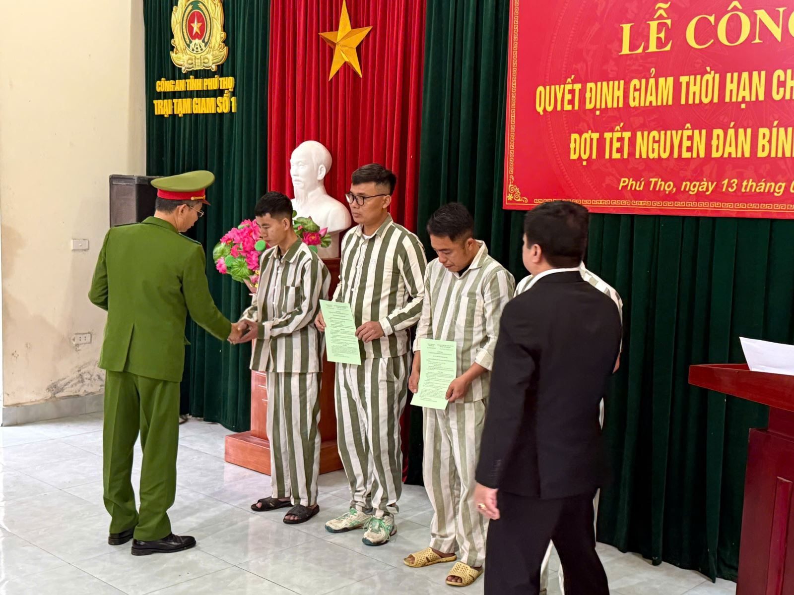 Tại buổi lễ, đại diện Trại tạm giam số 1 đã công bố quyết định của Tòa án nhân dân tỉnh Phú Thọ về việc giảm thời hạn chấp hành án phạt tù cho 12 phạm nhân đủ điều kiện theo quy định. Các phạm nhân được xét giảm án đều có quá trình chấp hành án nghiêm túc, tích cực lao động, học tập, cải tạo; chấp hành tốt nội quy cơ sở giam giữ và thể hiện sự ăn năn, hối cải.