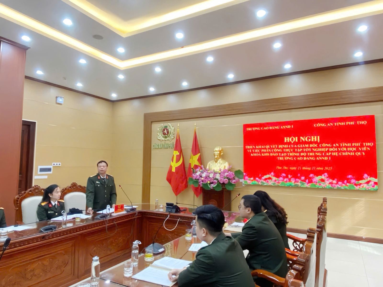 Thực hiện kế hoạch phối hợp giữa Công an tỉnh Phú Thọ và Trường Cao đẳng An ninh nhân dân I trong công tác đào tạo, bồi dưỡng học viên, sáng ngày 21/11/2025, thừa uỷ quyền của Ban Giám đốc Công an tỉnh, Phòng Tổ chức cán bộ đã tổ chức hội nghị công bố quyết định phân công thực tập tốt nghiệp cho 51 học viên khóa K55S trình độ Trung cấp hệ chính quy. Đây là hoạt động được triển khai thường xuyên nhằm giúp học viên rèn luyện kỹ năng thực tiễn, tiếp cận môi trường công tác tại Công an các đơn vị, địa phương.
