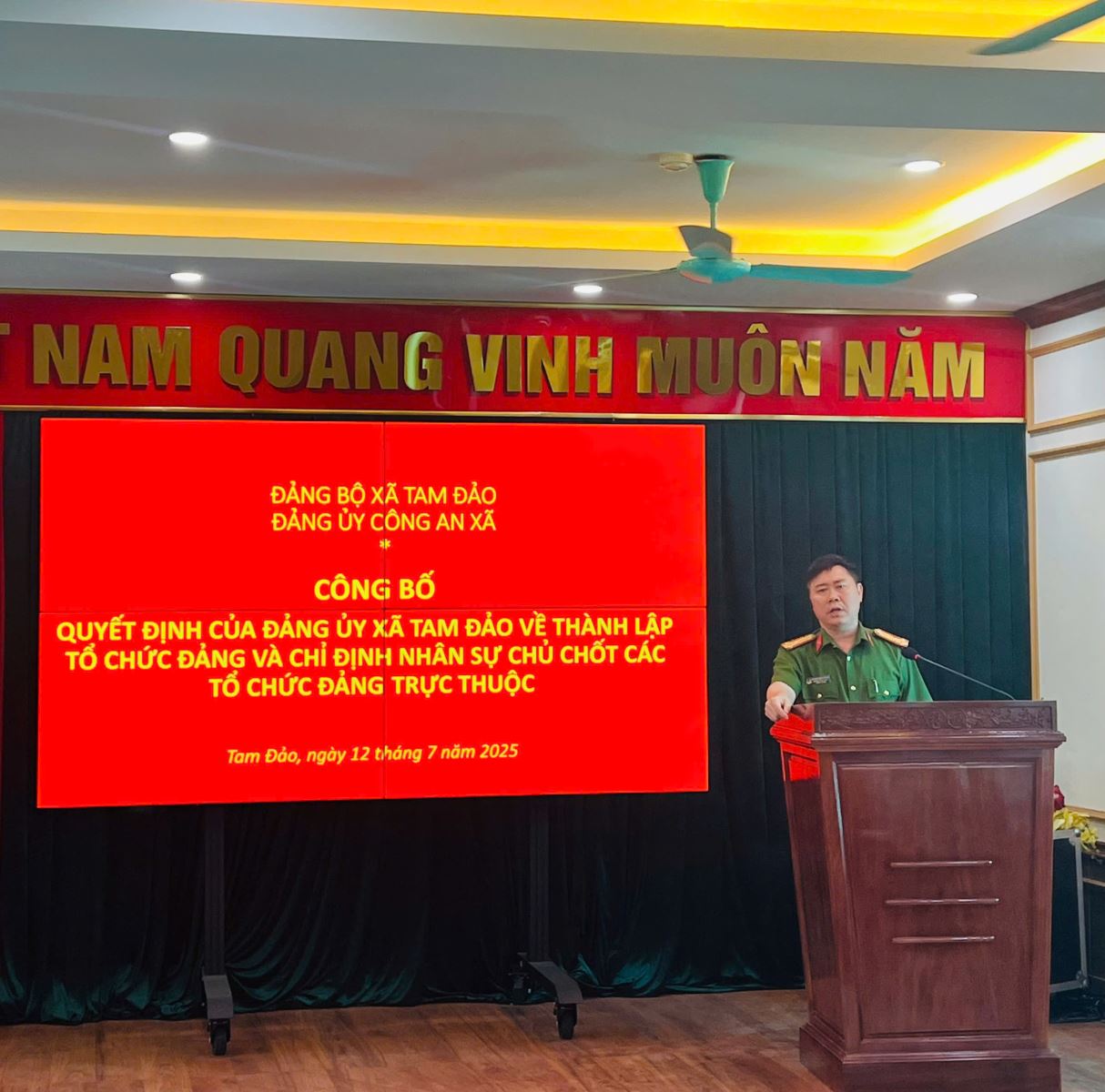 Thực hiện chủ trương sáp nhập đơn vị hành chính cấp xã theo Nghị quyết số 1676/NQ-UBTVQH15 ngày 16/06/2025 của Ủy ban Thường vụ Quốc hội về việc sắp xếp các đơn vị hành chính trên địa bàn tỉnh Phú Thọ, Công an xã Tam Đảo được kiện toàn về tổ chức bộ máy, nhân sự nhằm tăng cường sự lãnh đạo của Đảng đối với lực lượng Công an chính quy tại địa bàn cơ sở. Sáng ngày 12/7/2025, Đảng uỷ xã Tam Đảo đã công bố Quyết định thành lập Đảng bộ Công an xã Tam Đảo trực thuộc Đảng bộ xã.