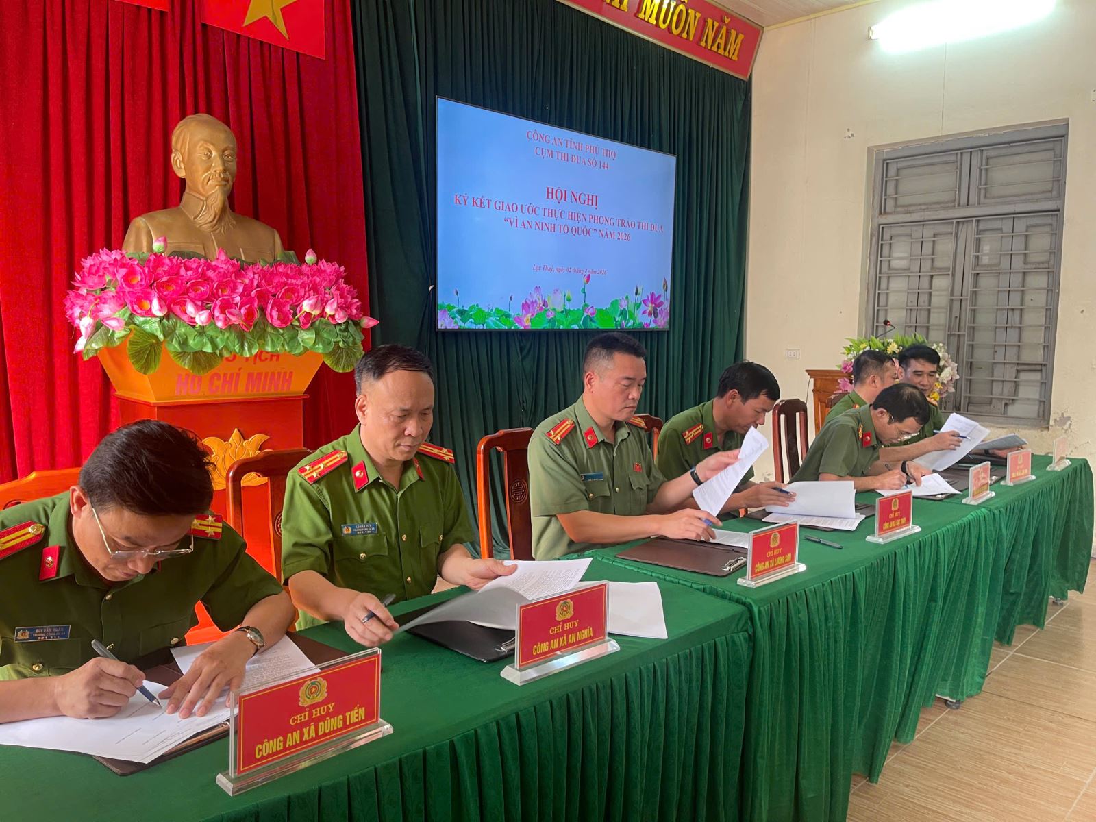 Trên cơ sở đó, hội nghị đã tiến hành ký kết quy chế phối hợp và giao ước thi đua năm 2026 giữa Công an các xã trong Cụm thi đua số 144. Việc ký kết thể hiện sự thống nhất, đoàn kết và quyết tâm cao của các đơn vị trong thực hiện phong trào thi đua “Vì an ninh Tổ quốc”, góp phần nâng cao hiệu quả công tác bảo đảm an ninh, trật tự tại địa bàn cơ sở.