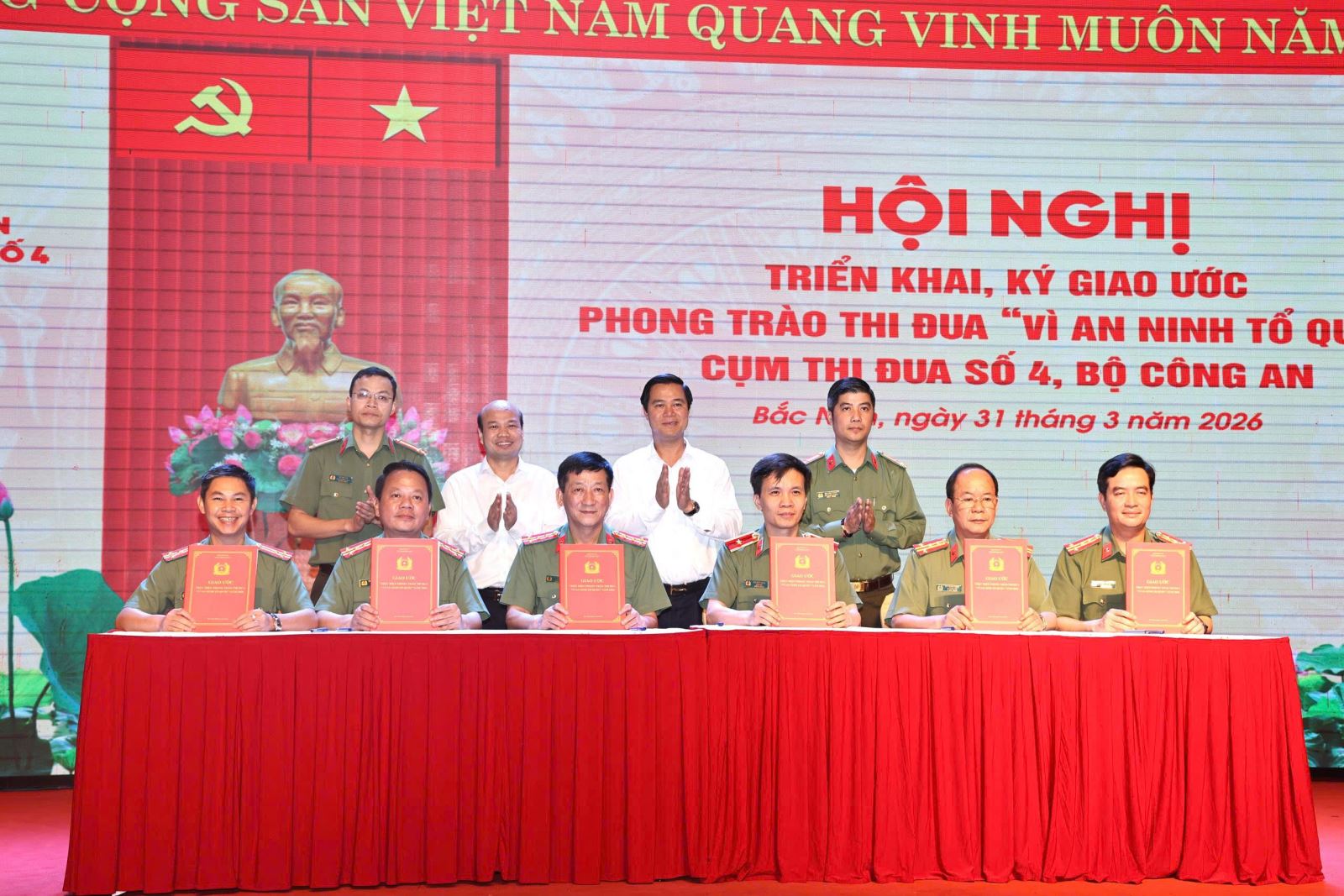 Ngày 31/3, tại tỉnh Bắc Ninh, Công an 6 tỉnh (Bắc Ninh, Hưng Yên, Lạng Sơn, Quảng Ninh, Phú Thọ, Thái Nguyên) thuộc Cụm thi đua số 4, Bộ Công an tổ chức hội nghị triển khai, ký giao ước phong trào thi đua “Vì an ninh Tổ quốc” năm 2026.