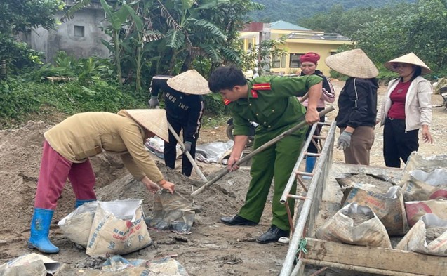 Bà con nhân dân và đoàn viên thanh niên Công an xã An Bình cùng nhau xây dựng con đường Tổ quốc