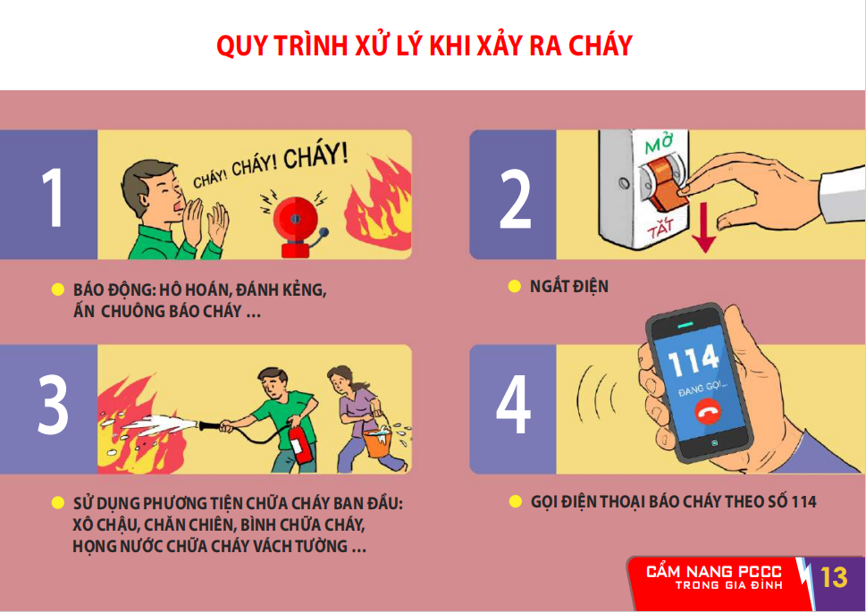 - Khi xảy ra cháy, nổ phải bình tĩnh xử lý, nhanh chóng báo cho lực lượng Cảnh sát PCCC qua số điện thoại 114.