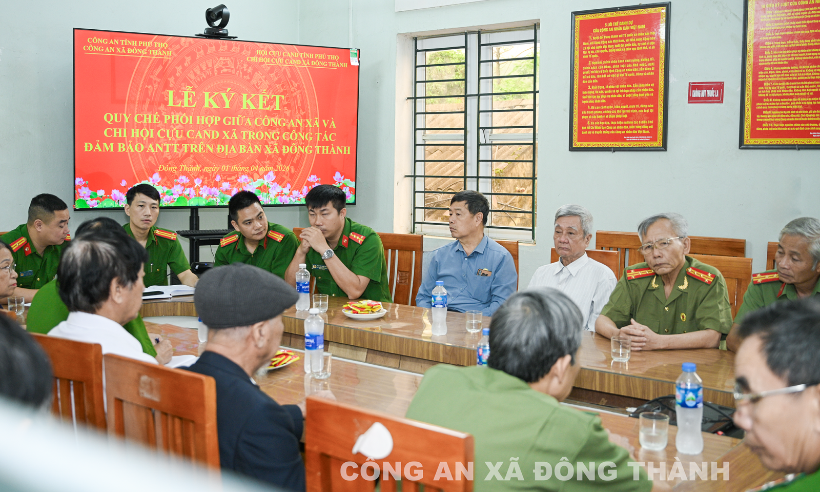 Sáng 01/4/2026, Công an xã Đông Thành tổ chức Hội nghị đánh giá tình hình an ninh, trật tự (ANTT) Quý I/2026 và ký kết Quy chế phối hợp với Chi hội Cựu Công an nhân dân (CAND) xã trong công tác bảo đảm ANTT trên địa bàn. Hội nghị nhằm tiếp tục phát huy vai trò, kinh nghiệm của lực lượng Cựu CAND, góp phần củng cố thế trận an ninh nhân dân ngay từ cơ sở.
