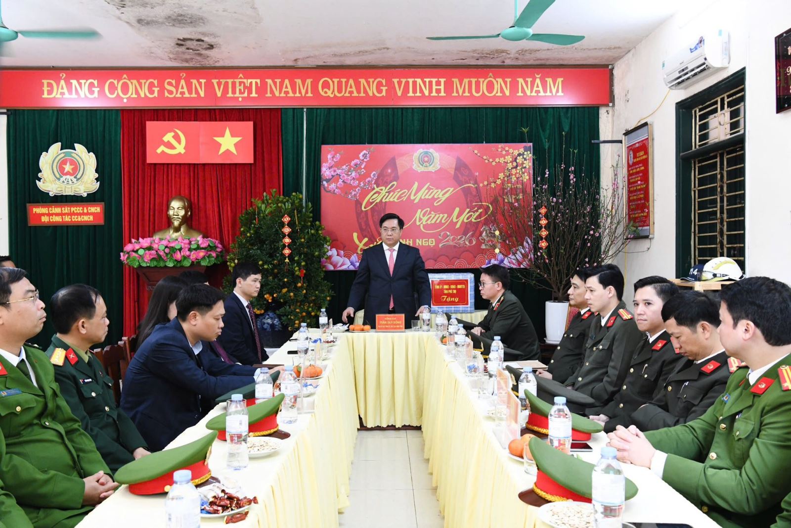 Tiếp đó, đồng chí Phó Bí thư Tỉnh ủy, Chủ tịch UBND tỉnh Phú Thọ Trần Duy Đông cùng đoàn công tác đã đến thăm, chúc Tết và động viên cán bộ, chiến sĩ Phòng Cảnh sát PCCC và CNCH. Tại chương trình, đồng chí Trưởng phòng Cảnh sát PCCC và CNCH đã báo cáo kết quả đảm bảo an toàn PCCC dịp Tết Nguyên đán và các lễ hội đầu năm; công tác duy trì chế độ trực chỉ huy, trực sẵn sàng chiến đấu 24/24 giờ; việc tăng cường kiểm tra an toàn PCCC tại các cơ sở trọng điểm, khu dân cư, nơi tập trung đông người; cũng như công tác chuẩn bị lực lượng, phương tiện, phương án chữa cháy và CNCH.