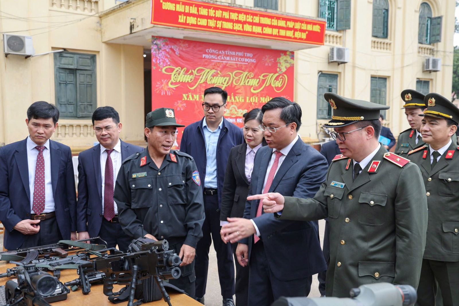 Thăm và chúc Tết Phòng Cảnh sát cơ động nhân dịp chuẩn bị đón năm mới, đồng chí Phó Bí thư Tỉnh ủy, Chủ tịch UBND tỉnh chúc cán bộ, chiến sĩ Phòng Cảnh sát cơ động năm mới Bính Ngọ 2026 sức khỏe, an khang, thịnh vượng, hoàn thành xuất sắc nhiệm vụ được giao. Đồng chí Phó Bí thư Tỉnh ủy, Chủ tịch UBND tỉnh ghi nhận, biểu dương những kết quả mà tập thể cán bộ, chiến sĩ Phòng Cảnh sát cơ động đạt được trong thời gian qua, nhất là kết quả bước đầu thực hiện đợt cao điểm tấn công trấn áp tội phảm bảo vệ Tết nguyên đán. Trong thời gian tới, đồng chí yêu cầu lực lượng Cảnh sát cơ động tiếp tục tăng cường tuần tra vũ trang để đảm bảo ANTT; duy trì thực hiện nghiêm túc công tác trực, sẵn sàng chiến đấu của lực lượng Cảnh sát cơ động để Nhân dân đón Tết Bính Ngọ 2026 an toàn.