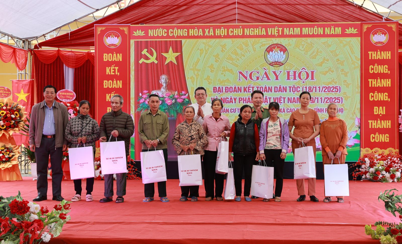 Thay mặt Tỉnh ủy, HĐND, UBND, Ủy ban MTTQ tỉnh, Thiếu tướng Nguyễn Minh Tuấn đã tặng lẵng hoa chúc mừng Ban Công tác Mặt trận khu dân cư thôn Sấu Thượng và trao 10 suất quà của tỉnh cho các hộ gia đình có hoàn cảnh khó khăn trên địa bàn. Nhân dịp này, cá nhân đồng chí Giám đốc Công an tỉnh đã trao 16 phần quà cho khu dân cư thôn Sấu Thượng cùng các hộ gia đình có hoàn cảnh khó khăn và học sinh vượt khó, đạt thành tích cao trong học tập.