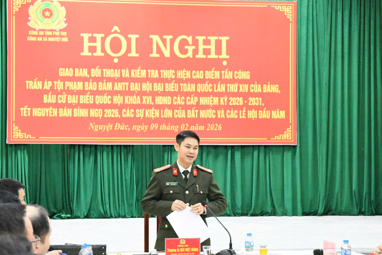 Nhằm triển khai đồng bộ, hiệu quả cao điểm tấn công, trấn áp tội phạm, bảo đảm an ninh, trật tự phục vụ Đại hội đại biểu toàn quốc lần thứ XIV của Đảng, bầu cử Đại biểu Quốc hội khóa XVI và Hội đồng nhân dân các cấp nhiệm kỳ 2026-2031, Tết Nguyên đán Bính Ngọ 2026, cùng các sự kiện chính trị quan trọng và lễ hội đầu xuân, ngày 09/02/2026, Công an tỉnh đã tổ chức Hội nghị giao ban, đối thoại và kiểm tra việc thực hiện cao điểm đối với Công an các xã Nguyệt Đức, Yên Lạc, Tam Hồng, Tề Lỗ và Liên Châu.