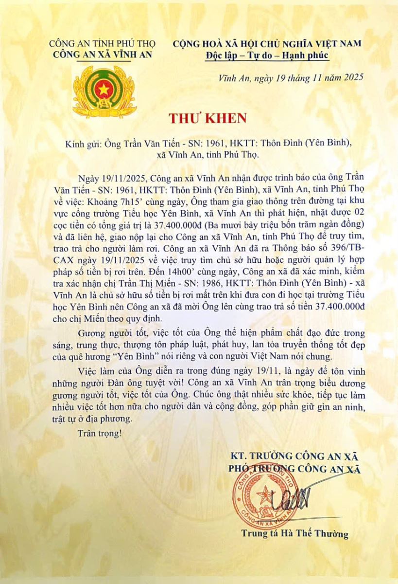 Ghi nhận nghĩa cử của công dân, Công an xã Vĩnh An đã gửi thư khen tới ông Tiến và đề xuất UBND xã xem xét tặng giấy khen để biểu dương, khích lệ tinh thần người tốt, việc tốt. Đây là hoạt động nhằm lan tỏa những giá trị tích cực trong xã hội, thúc đẩy phong trào toàn dân tham gia bảo vệ an ninh Tổ quốc, giữ gìn trật tự trên địa bàn.