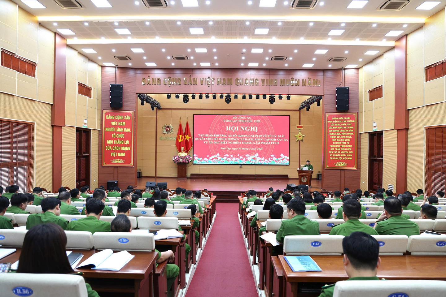 Với mục tiêu nâng cao năng lực lãnh đạo, chỉ huy trong công tác chỉ đạo xử lý, giải quyết các tình huống cấp bách, phức tạp khi xảy ra vụ án đặc biệt nghiêm trọng xâm phạm trật tự xã hội, ngày 20/3/2026, Công an tỉnh Phú Thọ tổ chức hội nghị tập huấn phương án số 1038 xử lý, giải quyết các tình huống cấp bách, phức tạp khi xảy ra vụ án đặc biệt nghiêm trọng xâm phạm TTXH cho lãnh đạo, chỉ huy các phòng khối Cảnh sát điều tra phòng, chống tội phạm và chỉ huy Công an 149 xã, phường, đồn Công an.