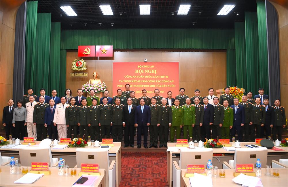 Thủ tướng Chính Phủ Phạm Minh Chính cùng các đại biểu dự hội nghị Tiếp tục giữ vai trò “tiên phong, dẫn dắt, gương mẫu, đi đầu” trong đổi mới, sáng tạo và chuyển đổi số quốc gia. Phát triển công nghiệp an ninh, xây dựng các doanh nghiệp mạnh của ngành Công an. Tiếp tục phát huy vai trò đi trước, mở đường trong công tác đối ngoại, để giữ vững an ninh quốc gia từ sớm, từ xa; tăng cường sự đóng góp của Việt Nam vào duy trì hoà bình trên thế giới. Tiếp tục giữ vững tinh thần đoàn kết, thống nhất, chung sức đồng lòng, gương mẫu đi đầu trong xây dựng, chỉnh đốn Đảng. Tiếp tục thực hiện có hiệu quả Nghị quyết số 12 của Bộ Chính trị về đẩy mạnh xây dựng lực lượng Công an trong sạch, vững mạnh, chính quy, tinh nhuệ, hiện đại và Nghị quyết số 18 của Trung ương để đổi mới, sắp xếp tổ chức bộ máy Công an các đơn vị, địa phương tinh, gọn, mạnh, hoạt động hiệu lực, hiệu quả. Có giải pháp đột phá để hoàn thành mục tiêu đưa 06 lực lượng tiến thẳng lên hiện đại vào năm 2025 và lực lượng CAND tiến lên hiện đại năm 2030. Tổ chức thành công các đại hôi đảng các cấp trong CAND, làm tốt công tác nhân sự công an tham gia cấp uỷ các cấp nhiệm kỳ 2025 – 2030; các hoạt động kỷ niệm 80 năm Ngày truyền thống CAND Việt Nam và 20 năm Ngày hội toàn dân bảo vệ an ninh Tổ quốc thiết thực, hiệu quả, tiết kiệm, có điểm nhấn…