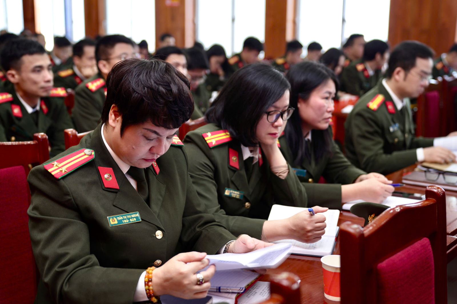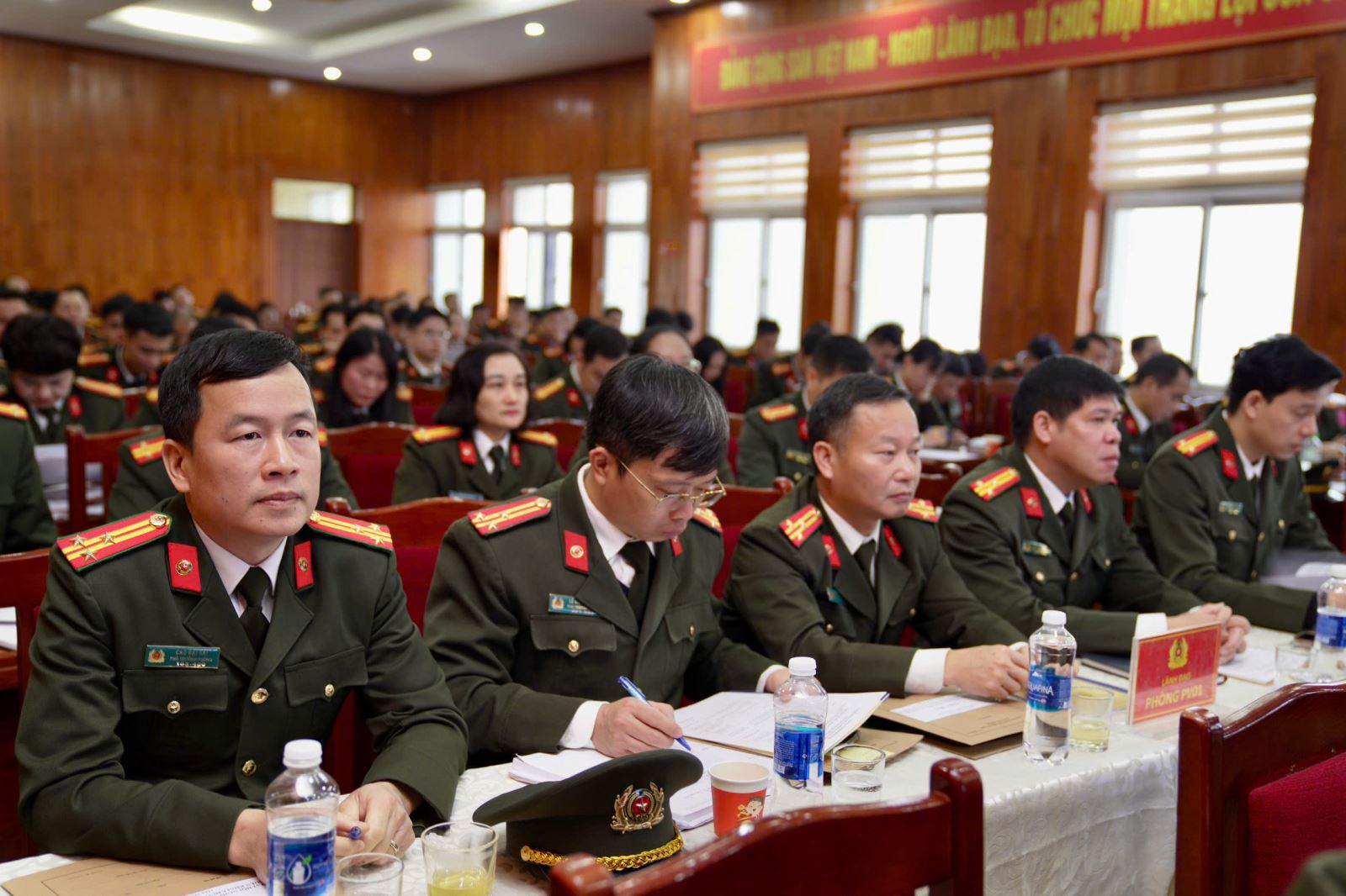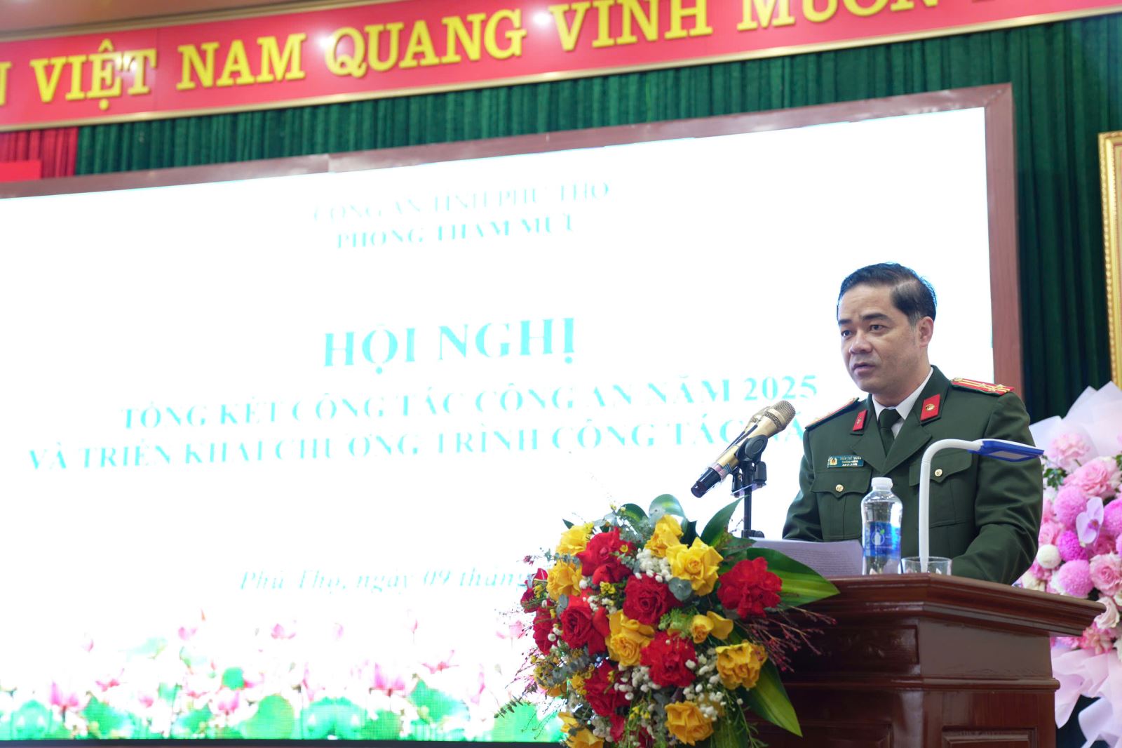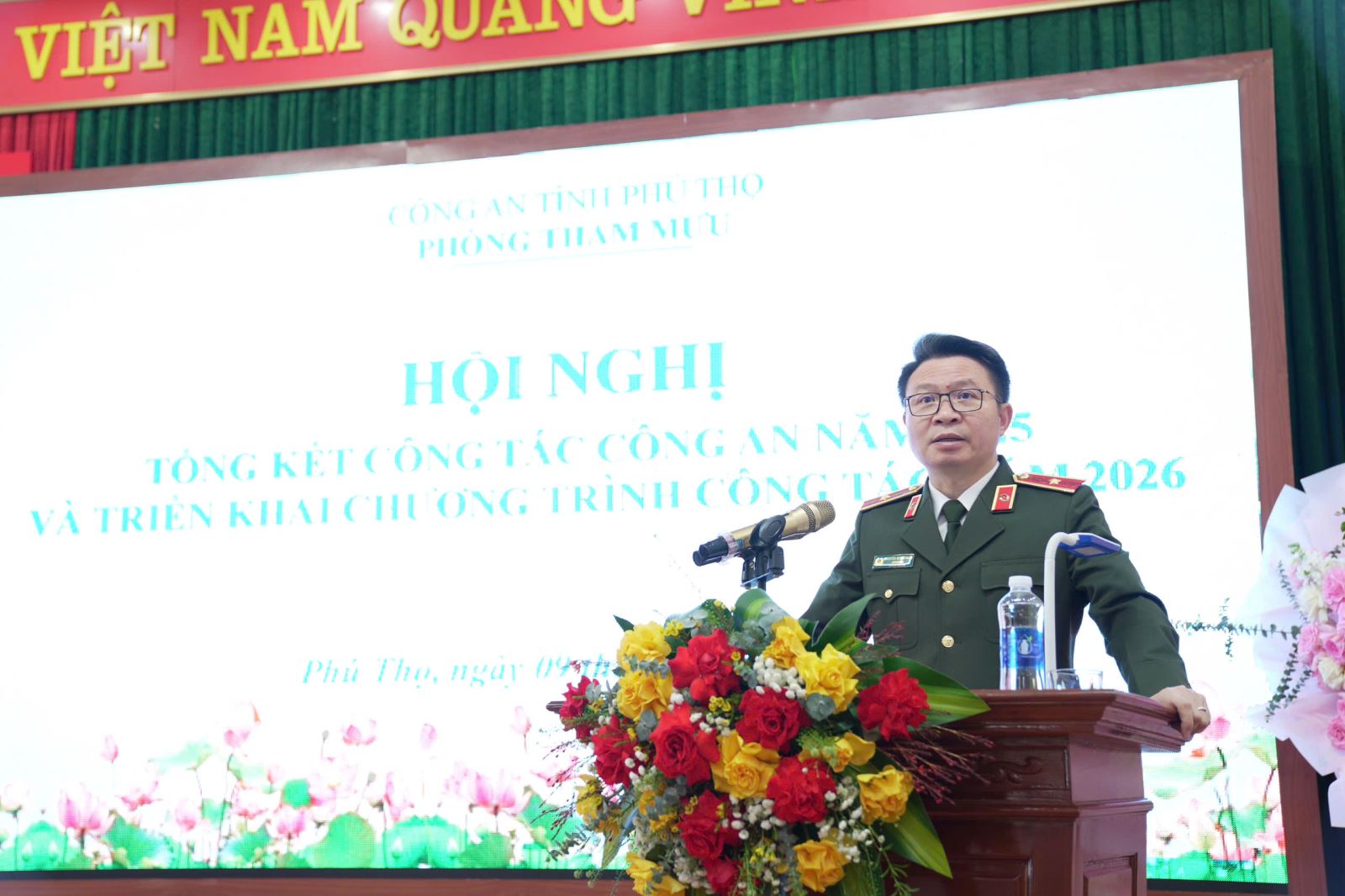 Phát biểu chỉ đạo Hội nghị, đồng chí Giám đốc Công an tỉnh ghi nhận, nhiệt liệt biểu dương và đánh giá cao những kết quả mà Phòng Tham mưu đạt được, góp phần quan trọng vào thành tích chung của Công an tỉnh Phú Thọ. Về nhiệm vụ trọng tâm năm 2026, đồng chí Giám đốc yêu cầu: Đảng ủy, lãnh đạo Phòng Tham mưu cần tiếp tục phát huy sự đoàn kết, thống nhất, tập trung lãnh đạo, chỉ đạo, chủ động làm tốt công tác nắm tình hình, phân tích, đánh giá, dự báo chính xác tình hình, bám sát các chủ trương của Đảng, Nhà nước, chỉ đạo của Bộ Công an, Công an tỉnh để kịp thời tham mưu, đề xuất Đảng ủy, Ban Giám đốc Công an tỉnh tham mưu cho Tỉnh ủy, UBND tỉnh các chủ trương, giải pháp bảo vệ an ninh chính trị, trật tự an toàn xã hội, trọng tâm trước mắt là bảo đảm tuyệt đối an ninh, an toàn Đại hội đại biểu toàn quốc lần thứ XIV của Đảng, bầu cử Đại biểu Quốc hội khóa XVI, bầu cử Hội đồng nhân dân các cấp nhiệm kỳ 2026 - 2031. Rà soát các nhóm chỉ tiêu công tác năm 2026 trong Nghị quyết của Đảng ủy Công an tỉnh để bổ sung, hoàn thiện Nghị quyết của Đảng ủy Phòng Tham mưu, tập trung lãnh đạo, chỉ đạo, hoàn thành xuất sắc nhiệm vụ được giao. Theo dõi, đôn đốc Công an các đơn vị trong tỉnh thực hiện có hiệu quả chỉ tiêu công tác; tập trung cao độ các giải pháp kiềm chế, kéo giảm bền vững các loại tội phạm; tiếp tục đổi mới phương thức lãnh đạo, nâng cao năng lực, chất lượng đội ngũ cán bộ, đảng viên. Xây dựng Đảng bộ, đơn vị trong sạch, vững mạnh toàn diện, hoạt động hiệu năng, hiệu lực, hiệu quả…