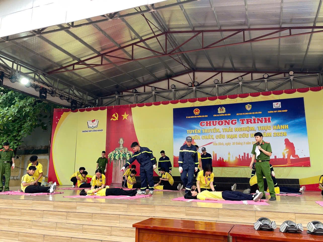 Chiều 20/3/2026, tại Trường THPT Công Nghiệp, Đội Chữa cháy và Cứu nạn, cứu hộ khu vực Hòa Bình phối hợp với Công an phường Hòa Bình tham mưu UBND phường tổ chức chương trình tuyên truyền, trải nghiệm, thực hành kỹ năng phòng cháy, chữa cháy (PCCC) và cứu nạn, cứu hộ (CNCH), thu hút hơn 1.600 người tham gia.