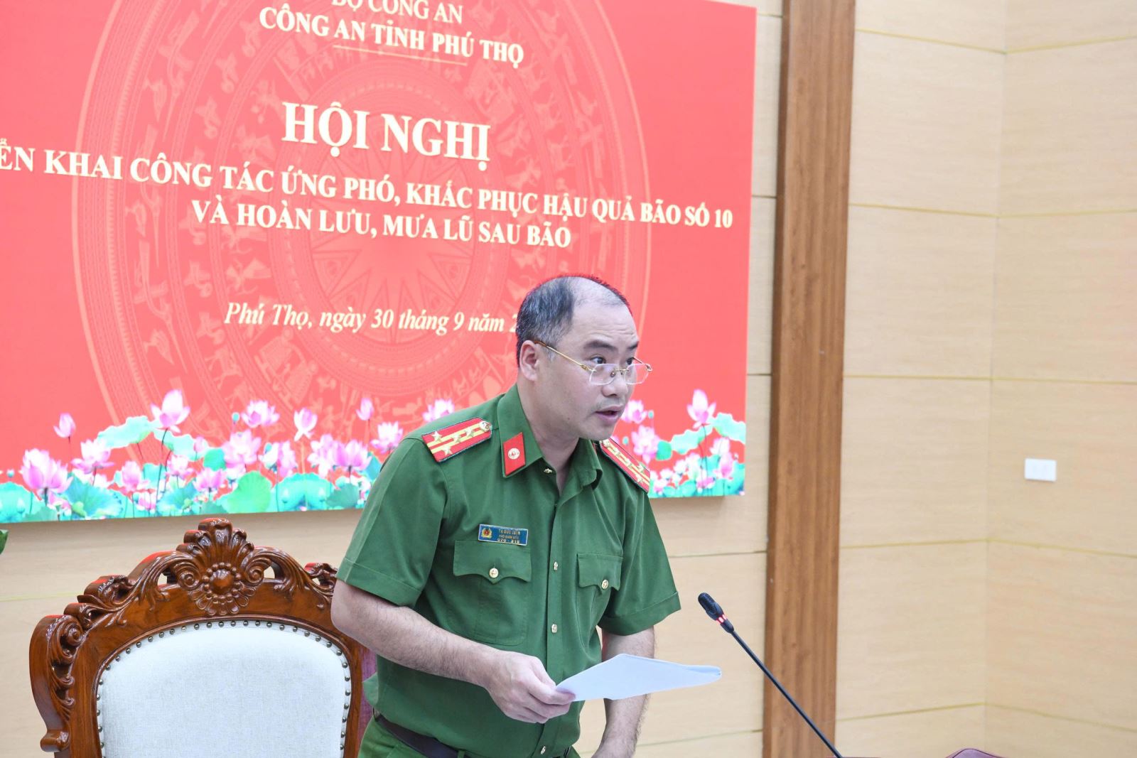Báo cáo tại hội nghị, Đại tá Tạ Đức Diễn, Phó Giám đốc Công an tỉnh Phú Thọ, cho biết: Công an tỉnh đã duy trì trực 100% quân số, chuẩn bị lực lượng, phương tiện, vật tư theo phương châm “bốn tại chỗ”, sẵn sàng ứng phó, cứu nạn cứu hộ với tinh thần “cứu dân, giúp dân” là trên hết. Công tác bảo đảm an toàn cho cán bộ, chiến sĩ, doanh trại, cũng như phối hợp với các lực lượng để khắc phục hậu quả mưa lũ được thực hiện thường xuyên, chủ động, quyết tâm không để bị động, bất ngờ.