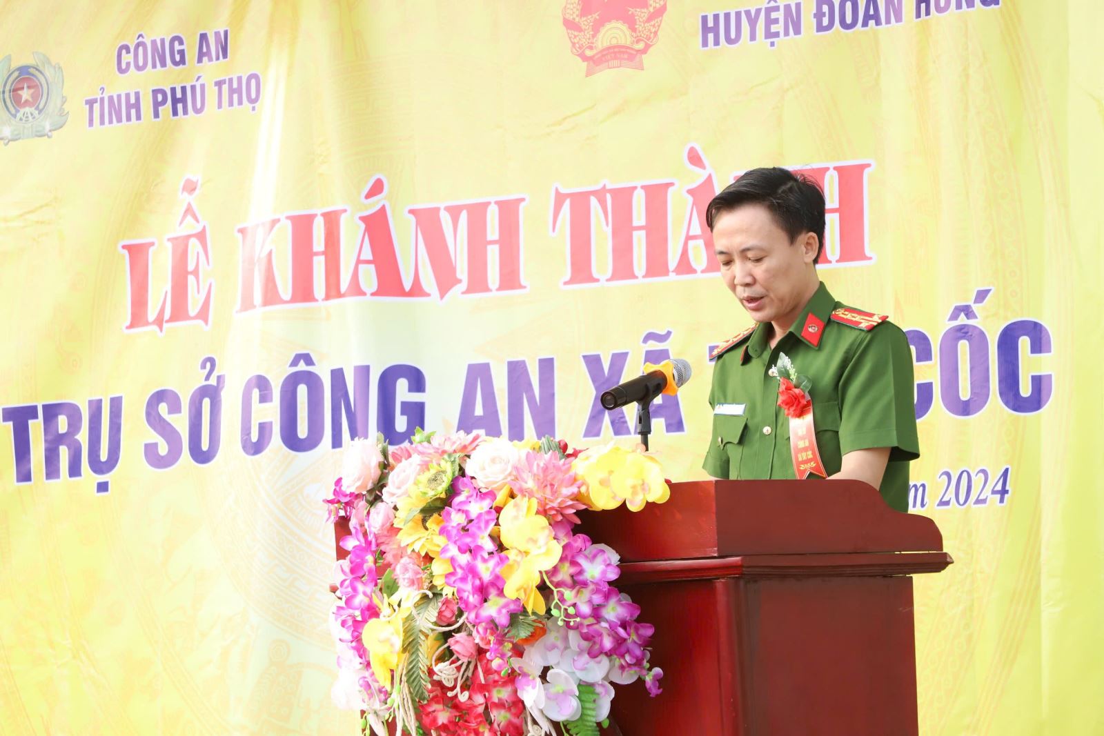 Đại tá Hoàng Nguyễn Phi Khanh - Phó Giám đốc Công an tỉnh phát biểu tại lễ khánh thành Phát biểu tại buổi lễ, đồng chí Đại tá Hoàng Nguyễn Phi Khanh - Phó Giám đốc Công an tỉnh cảm ơn sự quan tâm của Ban Thường vụ Huyện ủy Đoan Hùng và cấp ủy, chính quyền địa phương trong việc thực hiện chủ trương của cấp trên về việc xây dựng trụ sở làm việc độc lập cho Công an cấp xã. Đồng thời, trong thời gian tới, đồng chí Phó Giám đốc Công an tỉnh mong muốn, Lãnh đạo huyện Đoan Hùng tiếp tục quan tâm, hỗ trợ Công an huyện triển khai xây dựng trụ sở làm việc độc lập cho Công an các xã đảm bảo theo kế hoạch đề ra. Đồng chí Phó Giám đốc Công an tỉnh cũng yêu cầu Công an xã Tây Cốc sau khi tiếp nhận trụ sở làm việc cần nhanh chóng ổn định tổ chức, sắp xếp các phòng làm việc, cơ sở vật chất và trang thiết bị đảm bảo hiệu quả, đặc biệt phục vụ tốt công tác tiếp, giải quyết thủ tục hành chính cho các tổ chức và công dân. Đồng thời, nêu cao tinh thần trách nhiệm, đoàn kết, sáng tạo, chủ động nắm chắc tình hình địa bàn, kịp thời tham mưu, giải quyết tốt các vụ việc xảy ra nhằm đảm bảo an ninh trật tự ngay từ cơ sở.