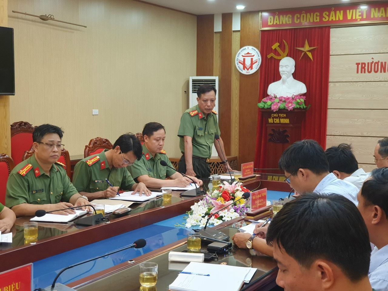 Đồng chí Tiến sỹ Hoàng Công Kiên nhất trí với ý kiến của đồng chí Đại tá Lâm Văn Vinh; đề nghị Công an tỉnh thường xuyên trao đổi khó khăn vướng mắc với nhà trường để phối hợp giải quyết đảm bảo tiến độ và an toàn trong quá trình luyện tập, diễn tập.