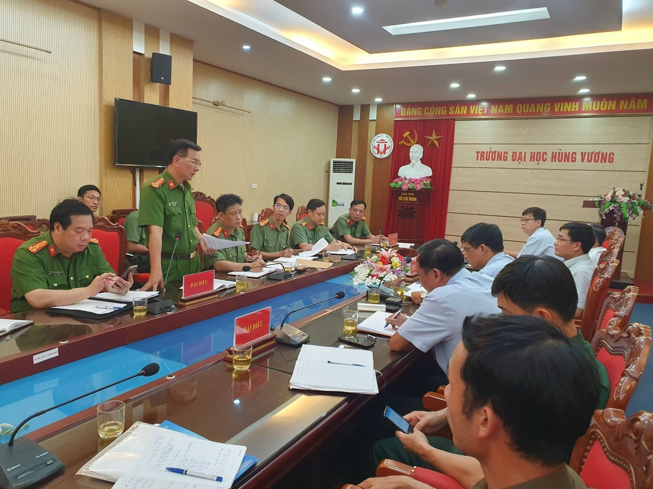 Ngày 10/6/2024, Công an tỉnh Phú Thọ đã có buổi làm việc với Trường Đại học Hùng Vương để khảo sát thực địa, thống nhất một số nội dung tổ chức diễn tập thực binh xử trí tình huống A2 trong diễn tập khu vực phòng thủ cấp tỉnh năm 2024. Chủ trì buổi làm việc có đồng chí Đại tá Lâm Văn Vinh - Phó Giám đốc Công an tỉnh. Tham dự buổi làm việc còn có đồng chí Tiến sỹ Hoàng Công Kiên - Hiệu trưởng trường Đại học Hùng Vương.