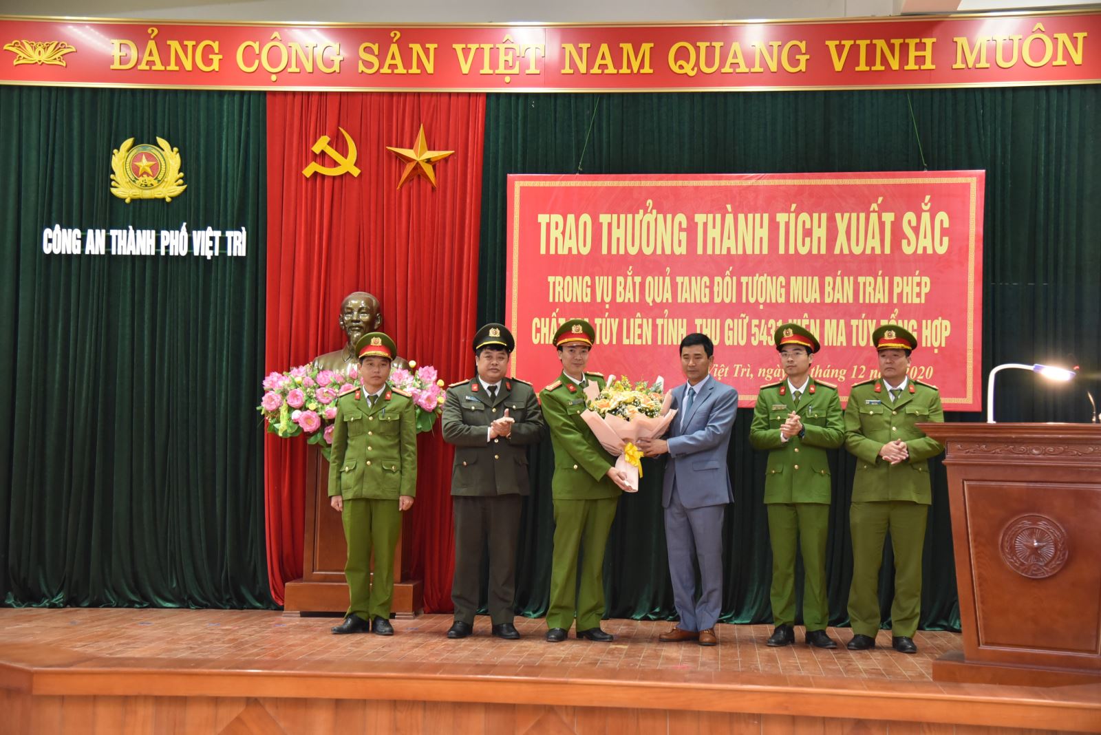 Đồng chí Thượng tá Nguyễn Minh Tuấn, Phó Giám đốc Công an tỉnh, Thủ trưởng Cơ quan CSĐT Công an tỉnh Phú Thọ tặng hoa chúc mừng Công an thành phố Việt Trì đã lập chiến công xuất sắc bắt giữ đối tượng tàng trữ, vận chuyển, mua bán trái phép hơn 5000 viên ma túy tổng hợp. Ghi nhận chiến công xuất sắc của Công an thành phố Việt Trì, các đồng chí lãnh đạo Tỉnh ủy, UBND tỉnh, Đảng ủy, Ban Giám đốc Công an tỉnh và Thành ủy, UBND thành phố Việt Trì và đã tặng hoa chức mừng và thưởng nóng cho Công an thành phố Việt Trì.