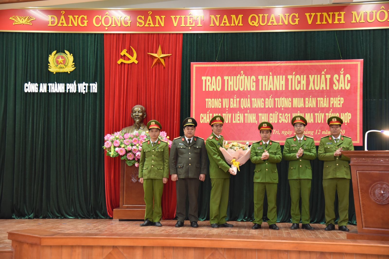 Sáng 22/12, UBND tỉnh, Công an tỉnh Phú Thọ và UBND thành Phố Việt Trì đã tổ chức trao thưởng cho lãnh đạo, CBCS Công an thành phố Việt Trì vì đã có thành tích xuất sắc bắt giữ đối tượng tàng trữ, vận chuyển, mua bán trái phép 5431 viên ma túy tổng hợp. Dự buổi trao thưởng có đồng chí Hồ Đại Dũng, Ủy viên BTV Tỉnh ủy, Phó Chủ tịch UBND tỉnh, Trưởng Ban chỉ đạo phòng chống tội phạm, TNXH và Phong trào Toàn dân bảo vệ an ninh Tổ quốc tỉnh Phú Thọ, đại diện Lãnh đạo Thành ủy, UBND thành phố Việt Trì, Đại diện Đảng ủy, Ban Giám đốc Công an tỉnh.