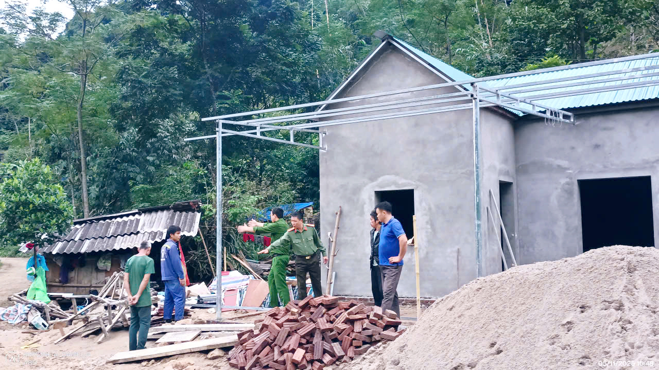 Tại xóm Thung, công trình “Nhà tình nghĩa” đã hoàn thành phần thô (tường, mái), hiện đang thi công phần hiên và các hạng mục hoàn thiện. Tổ công tác cùng đại diện Công an xã, chính quyền cơ sở kiểm tra hiện trạng, đối chiếu hồ sơ, ghi nhận khối lượng thi công; đồng thời yêu cầu đơn vị thi công bảo đảm an toàn lao động, chất lượng vật liệu, xử lý chống thấm, lắp đặt hệ thống điện – nước đúng kỹ thuật. Địa phương cam kết cập nhật tiến độ hằng tuần, phấn đấu hoàn thành, bàn giao công trình đúng kế hoạch đề ra.