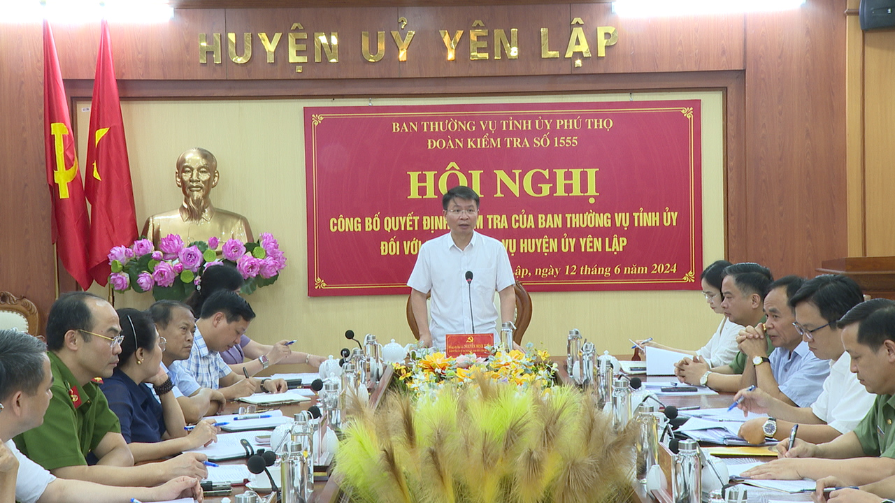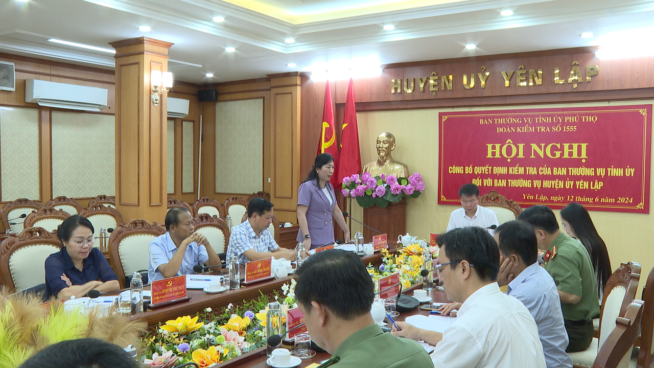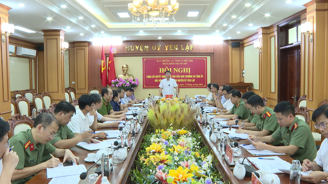 Ngày 12/6, Đoàn kiểm tra của Tỉnh uỷ Phú Thọ do đồng chí Đại tá Nguyễn Minh Tuấn - Uỷ viên BTV Tỉnh uỷ, Bí thư Đảng uỷ, Giám đốc Công an tỉnh làm trưởng đoàn đã làm việc với Huyện uỷ Yên Lập, công bố quyết định kiểm tra việc thực hiện Nghị quyết số 48-NQ/TU ngày 19/7/2021 của Ban Thường vụ Tỉnh ủy về nhiệm vụ bảo vệ an ninh quốc gia, bảo đảm trật tự, an toàn xã hội trên địa bàn huyện Yên Lập; gắn với thực hiện một số nghị quyết, chỉ thị của Trung ương và của tỉnh về bảo vệ an ninh chính trị, giữ gìn trật tự, an toàn xã hội trên địa bàn tỉnh Phú Thọ. Đại diện địa phương làm việc với Đoàn kiểm tra có đồng chí Nguyễn Thị Phương Hạnh, Uỷ viên BCH Đảng bộ tỉnh, Bí thư Huyện uỷ Yên Lập.