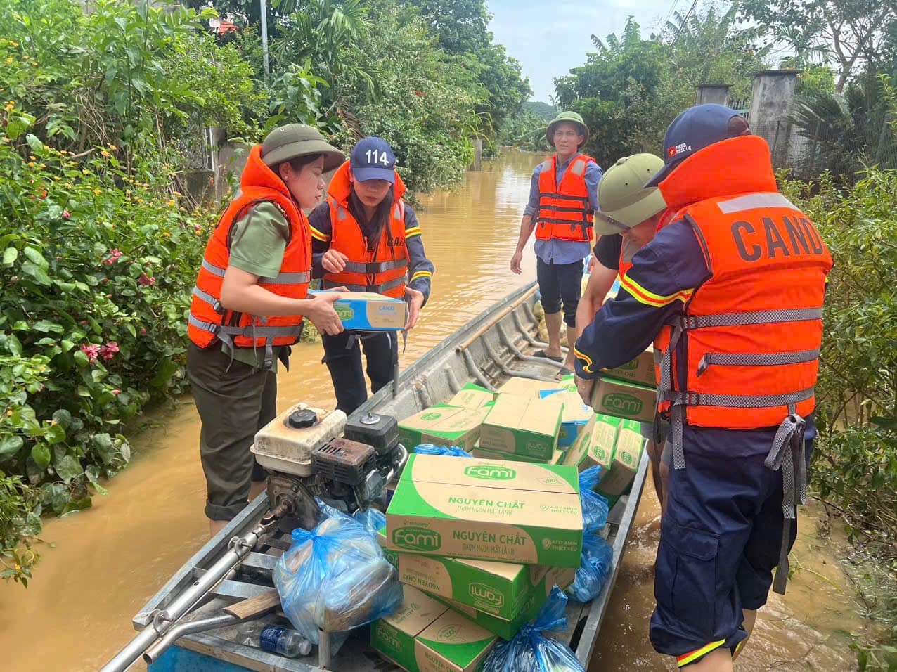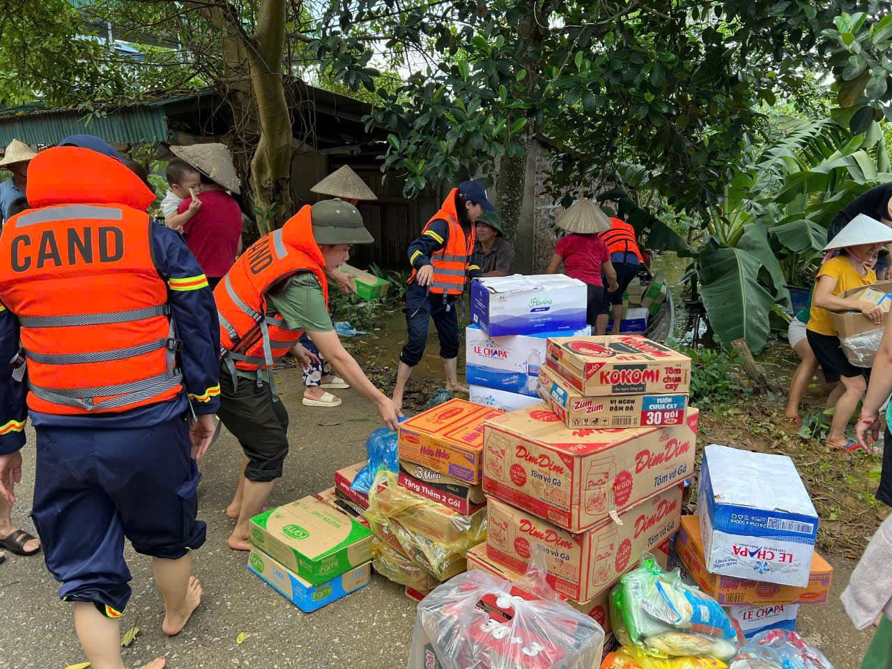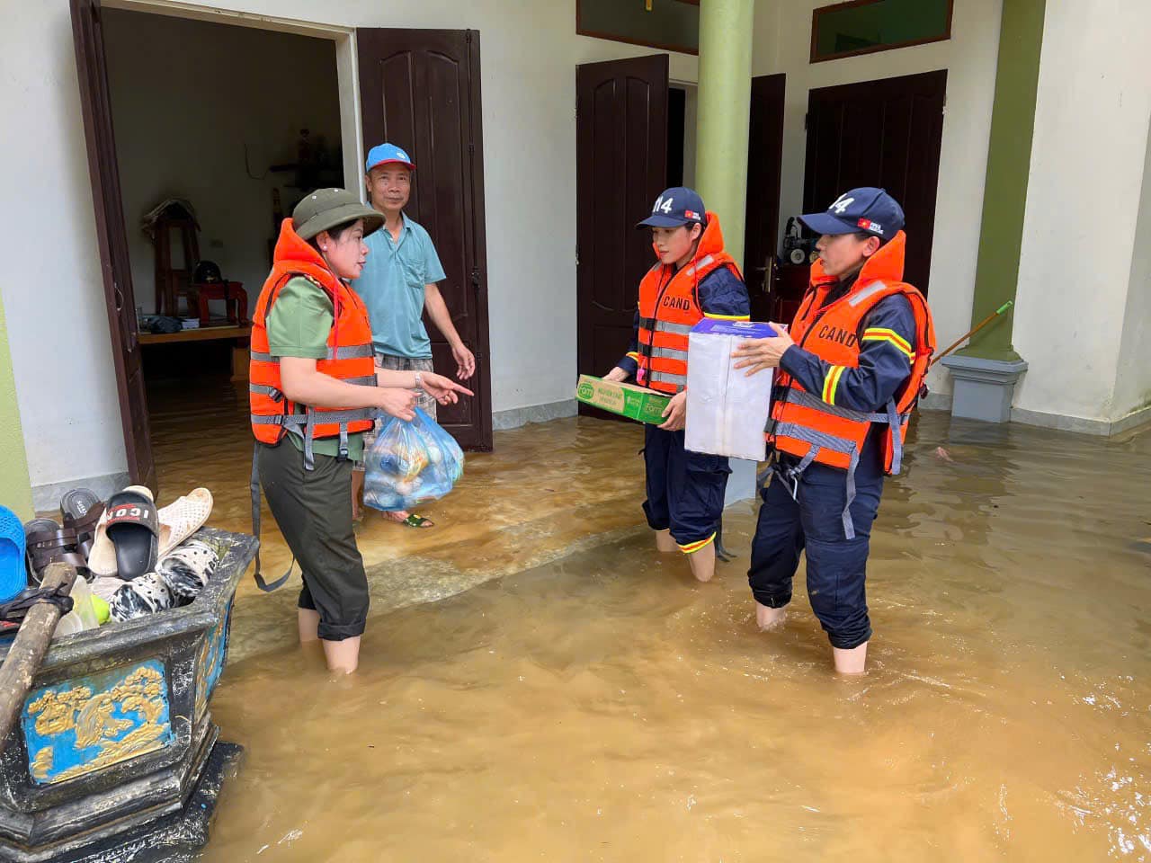 Cùng với tinh thần khẩn trương, liên tục tuần tra, kiểm soát trên các khu vực ngập lụt để tổ chức cứu nạn, cứu hộ và hỗ trợ người dân tại các khu vực ngập sâu, lực lượng Cảnh sát PCCC&CNCH đã phối hợp với các các lực lượng chức năng tổ chức hỗ trợ vận chuyển các nhu yếu phẩm thiết yếu để hỗ trợ, đảm bảo đời sống, sinh hoạt cho nhân dân tại các khu vực ngập lụt bị chia cắt. Tại huyện Hạ Hòa, hàng trăm xuất quà gồm các nhu yếu phẩm, lương thực thiết yếu đã được cứu trợ đến người dân.