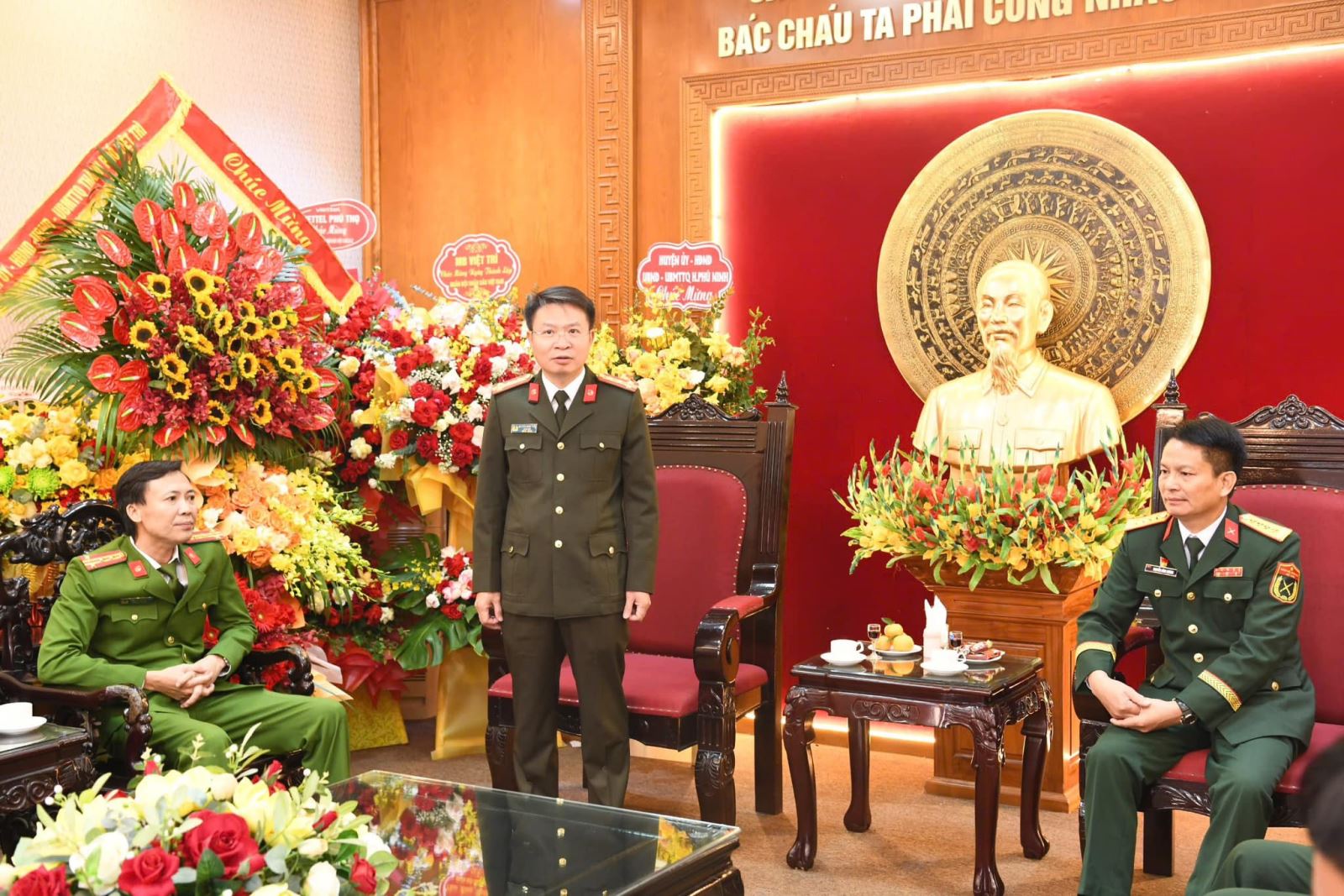 Tại buổi chúc mừng, thay mặt Đảng uỷ, lãnh đạo Công an tỉnh, đồng chí Đại tá Nguyễn Minh Tuấn, Giám đốc Công an tỉnh đã gửi lời chúc mừng tốt đẹp nhất đến tập thể lãnh đạo, cán bộ, chiến sĩ Bộ Chỉ huy Quân sự tỉnh nhân dịp kỷ niệm 80 năm ngày thành lập Quân đội nhân dân Việt Nam. Đồng chí đánh giá cao mối quan hệ phối hợp giữa các đơn vị lực lượng vũ trang trên địa bàn tỉnh. Đồng thời, tin tưởng trong thời gian tới, lực lượng Công an, Quân đội sẽ tiếp tục phát huy tinh thần đoàn kết, nhất là trong công tác phối hợp thực hiện nhiệm vụ bảo vệ an ninh quốc gia, bảo đảm trật tự an toàn xã hội, đấu tranh phòng, chống tội phạm; kịp thời xử lý các tình huống đột xuất, bất ngờ, giữ vững an ninh chính trị, trật tự, an toàn xã hội trên địa bàn. Đồng chí Đại tá Nguyễn Minh Tuấn, Giám đốc Công an tỉnh mong muốn trong thời gian tới, hai lực lượng sẽ tiếp tục phối hợp, hiệp đồng chặt chẽ, hoàn thành tốt mọi nhiệm vụ được Đảng, Nhà nước và Nhân dân giao phó.