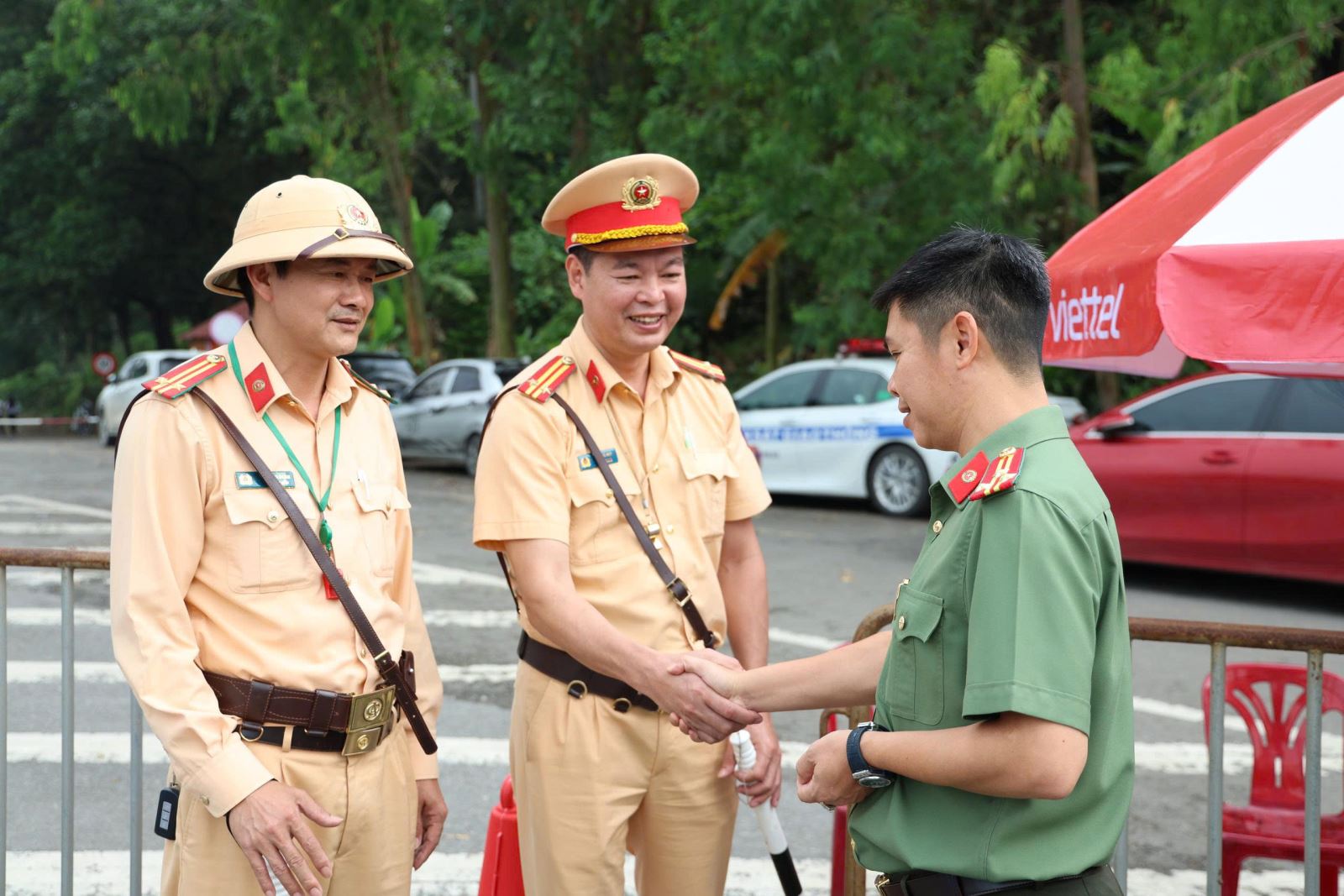 Thượng tá Bùi Việt Hùng, Phó Bí thư Đảng ủy, Phó Giám đốc Công an tỉnh động viên tinh thần các đồng chí làm nhiệm vụ phân làn giao thông tại Đền Hùng