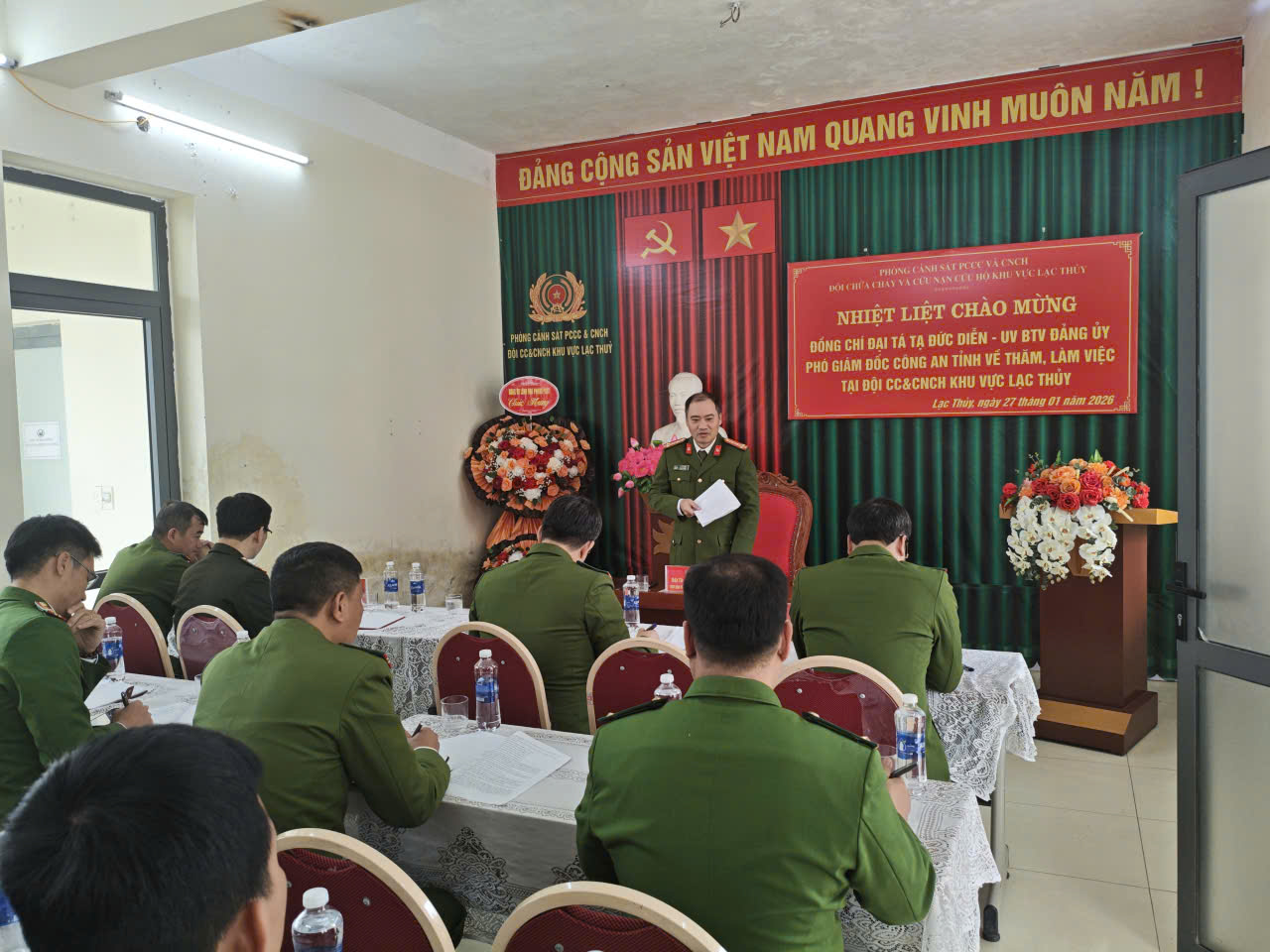 Nhằm nắm bắt tình hình thực tế, kịp thời chỉ đạo công tác phòng cháy, chữa cháy và cứu nạn, cứu hộ tại cơ sở, sáng 27/01/2026, đồng chí Đại tá Tạ Đức Diễn, Ủy viên Ban Thường vụ Đảng ủy, Phó Giám đốc Công an tỉnh Phú Thọ đã đến thăm và làm việc tại Đội Chữa cháy và cứu nạn, cứu hộ khu vực Lạc Thủy, Phòng Cảnh sát PCCC và CNCH Công an tỉnh.