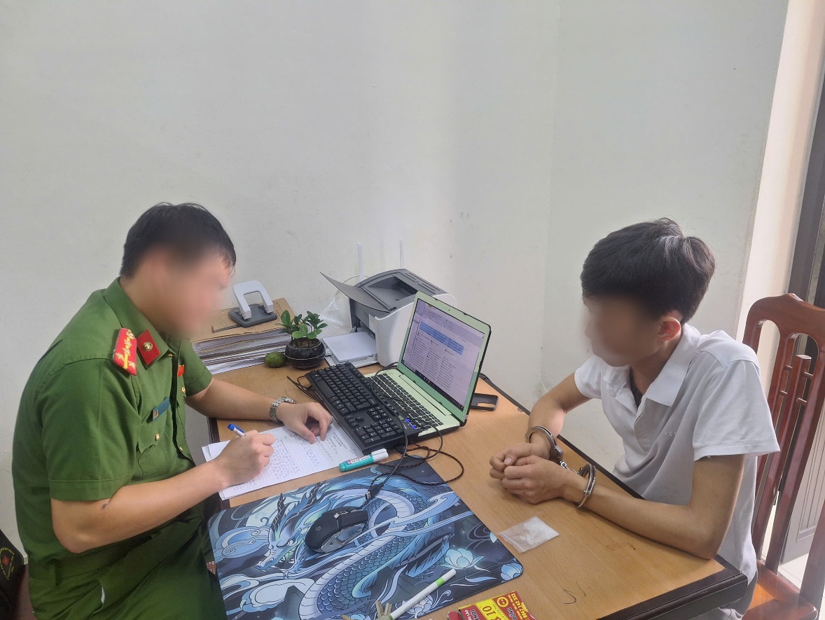 Cán bộ Công an xã Lập Thạch làm việc với đối tượng tượng bị bắt về tội tàng trữ trái phép chất ma túy