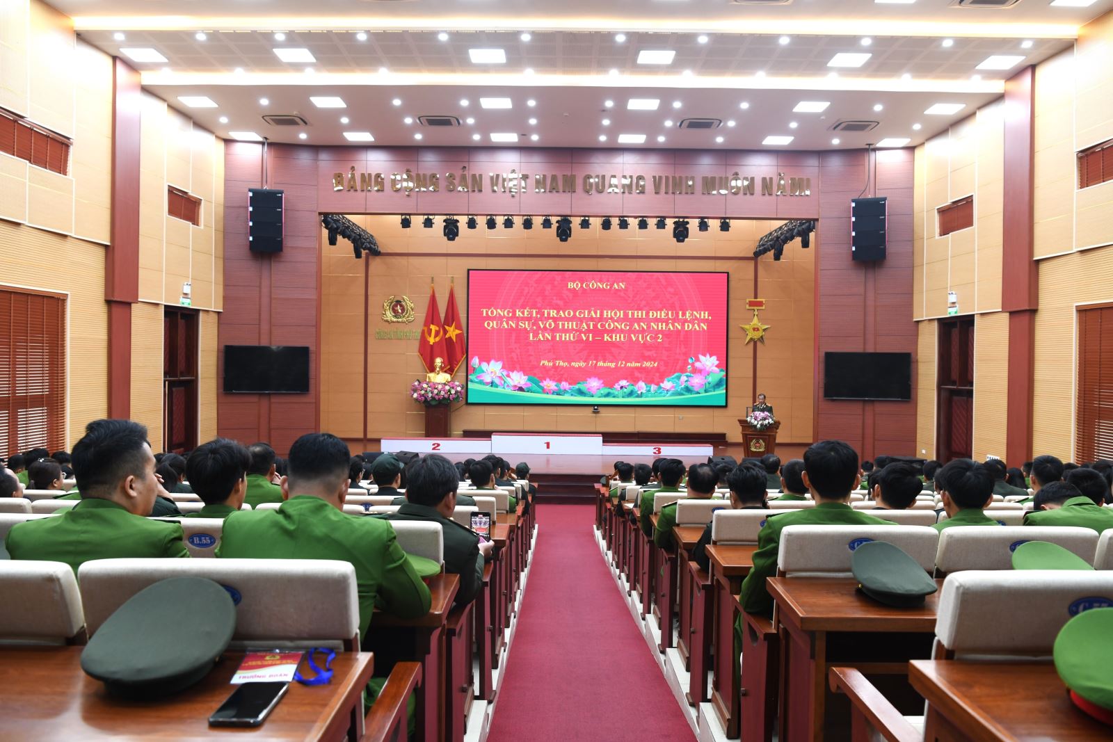Sáng 17/12, Ban Tổ chức Đại hội khỏe và Hội thi điều lệnh, quân sự, võ thuật CAND lần thứ VI – khu vực 2 đã tổ chức Lễ Tổng kết và trao giải Hội thi điều lệnh, quân sự, võ thuật CAND. Dự chỉ đạo buổi lễ có đồng chí Thiếu tướng Lê Hồng Hiệp - Phó Cục trưởng Cục Công tác Đảng và Công tác chính trị, Bộ Công an, Phó Trưởng ban Chỉ đạo Đại hội khỏe và Hội thi Bộ Công an, Phó Trưởng ban Thường trực Ban tổ chức Đại hội khỏe và Hội thi - Khu vực 2; Đồng chí Đại tá Nguyễn Minh Tuấn, Ủy viên BTV Tỉnh ủy, Giám đốc Công an tỉnh Phú Thọ; các đồng chí Thành viên Ban Tổ chức Đại hội khỏe và Hội thi - Khu vực 2; các đồng chí trong Đảng ủy, Ban Giám đốc Công an tỉnh Phú Thọ; lãnh đạo, cán bộ chiến sỹ Công an 21 địa phương tham gia Đại hội khỏe và Hội thi - Khu vực 2.