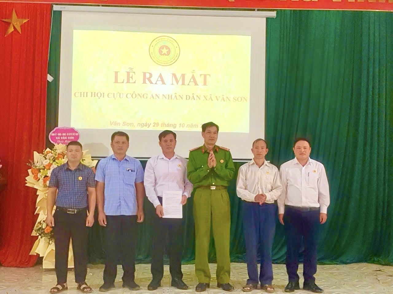 Ngày 29/10/2025, Công an xã Vân Sơn phối hợp với Hội Cựu Công an nhân dân tỉnh Phú Thọ và chính quyền địa phương tổ chức Lễ ra mắt Chi hội Cựu Công an nhân dân xã Vân Sơn. Đây là hoạt động nhằm cụ thể hóa chủ trương tăng cường gắn kết, phát huy vai trò của đội ngũ cán bộ, chiến sĩ Công an đã nghỉ hưu trong công tác bảo đảm an ninh, trật tự tại cơ sở.