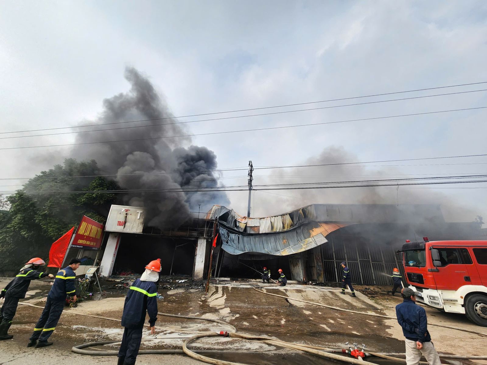 Đến khoảng 15 giờ 45 phút cùng ngày, đám cháy được khống chế và dập tắt hoàn toàn, bảo đảm an toàn cho lực lượng tham gia chữa cháy và người dân. Qua xác minh ban đầu, đám cháy xuất phát từ Hộ kinh doanh Hoa lụa Thịnh Tình do Ông Bùi Đ. Th. - SN: 1991, HKTT: khu 4, xã Vĩnh Hưng, Phú Thọ làm chủ hộ kinh doanh, diện tích hộ kinh doanh Hoa lụa Thịnh Tình khoảng 100m2. Đám cháy làm thiêu rụi toàn bộ công trình. Ngọn lửa sau đó cháy lan sang 03 hộ kinh doanh liền kề, gồm: Hộ kinh doanh Tô Văn Ng. diện tích cháy 60m2; Hộ kinh doanh Nguyễn Văn Q. diện tích cháy 60m2; Hộ kinh doanh Tô Thị Th. diện tích cháy khoảng 1 m2. Vụ cháy không gây thiệt hại về người, ước tính thiệt hại tài sản khoảng 85 triệu đồng. Nguyên nhân vụ cháy do chủ hộ kinh doanh Hoa lụa Thịnh Tình báo cáo là do chập điện.