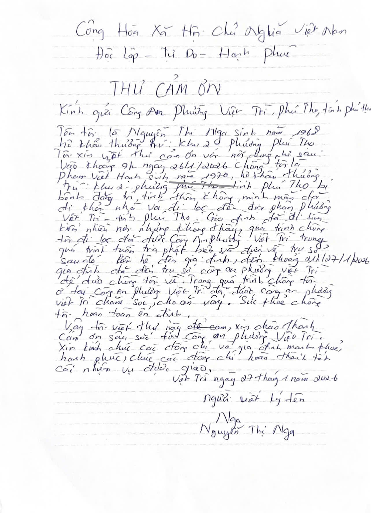 Thư cảm ơn của người dân gửi Công an phường Việt Trì hỗ trợ tìm người thân