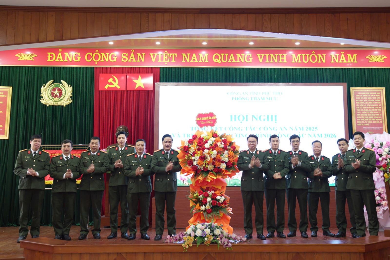 Đồng chí Giám đốc Công an tỉnh tặng hoa chúc mừng thành tích của Phòng Tham mưu tại Hội nghị tổng kết công tác Công an năm 2025, triển khai công tác năm 2026 Chủ động tham mưu triển khai quyết liệt các biện pháp công tác nghiệp vụ, hướng dẫn Công an cấp xã trong triển khai các biện pháp công tác Công an, bảo đảm giữ vững an ninh, trật tự ngay tại cơ sở, không để bị động, bất ngờ trong mọi tình huống; không để ngắt quãng, gián đoạn trong giải quyết các thủ tục cho người dân, doanh nghiệp… góp phần quan trọng giúp tỉnh Phú Thọ duy trì tốc độ tăng trưởng “hai con số” trong năm 2025.