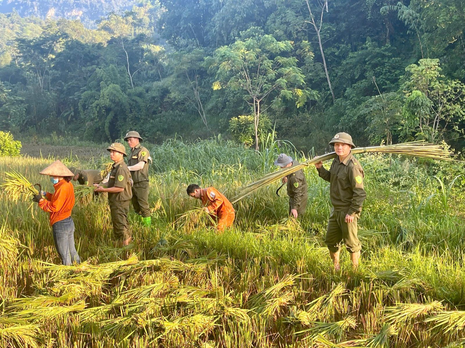 Lực lượng bảo vệ ANTT ở cơ sở giúp Nhân dân thu hoạch lúa