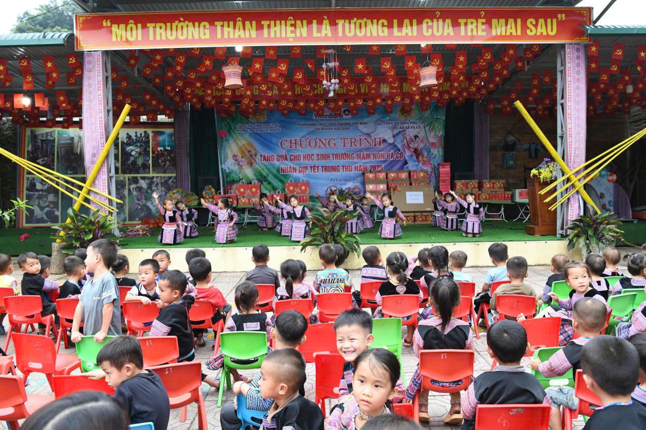 Hòa chung không khí rộn ràng của Tết Trung thu năm 2025, chiều ngày 03/10 (tức 12/8 âm lịch), Phòng An ninh kinh tế Công an tỉnh Phú Thọ phối hợp với Ngân hàng TMCP Công thương Việt Nam (VietinBank) chi nhánh Hòa Bình, UBND xã Pà Cò, Công an xã Pà Cò và Trường Mầm non xã Pà Cò đã tổ chức chương trình “Trung thu yêu thương” dành cho 255 cháu học sinh mầm non trên địa bàn.